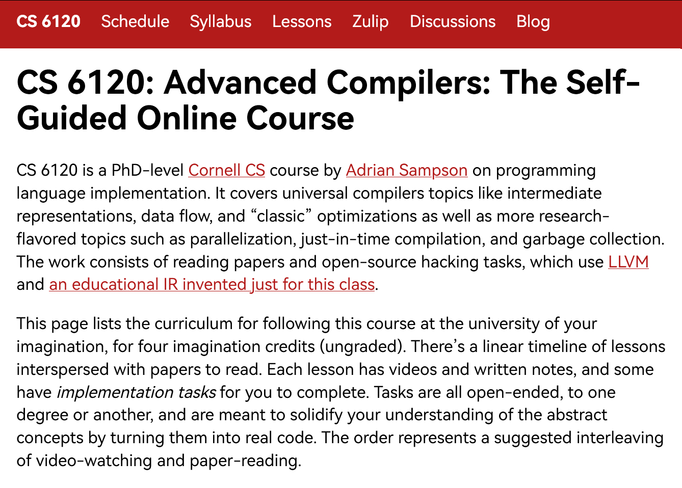 古法编程 康奈尔大学的CS 6120高级编译器课程自学在线课程www.cs.cornell.edu/courses/cs6120/2025fa/self-guided/CS 6120 是康奈尔大学博士级计算机科学课程,由 Adrian Sampson 授课,主题为编程语言实现。课程涵盖通用编译器的内容,如中间表示、数据流和“经典”优化,也涉及更多研究方向的主题,例如并行化、即时编译和垃圾回收。