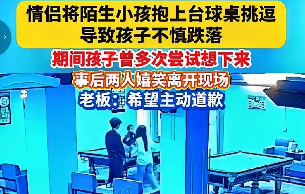 太坏了!台球厅里,一对小情侣看到一个两三岁的小孩独自在那里玩,他们就把孩子抱到台球桌上,孩子看起来很害怕,一直伸手想让他们把他抱下来。 近日,一段发生在台球厅的监控视频在网络上传播,视频里一对年轻情侣的行为,让不少网友看完既心疼又愤怒。 事发时,一名只有两三岁的幼儿独自在台球厅内玩耍,孩子是店铺老板的小孩,家长因临时处理琐事短暂离开,没想到就这一小段时间,孩子遭遇了让人揪心的对待。 这对小情侣看到孩子后,没有选择避让或告知家长,反而直接将年幼的孩子抱上光滑的台球桌。 两三岁的孩子本就对高处和陌生环境充满恐惧,孩子全程表现出明显的不安,一直伸手示意想要下来。 面对孩子清晰的求救信号,两人非但没有及时将孩子抱回安全地面,反而在一旁停留观望,甚至在孩子试图挪动时,做出假意伸手又突然收回的动作,直接导致孩子失去平衡,从台球桌上重重摔落在地。 孩子摔倒后立刻大哭,头部被磕出包,身体和心理都受到极大惊吓。可这对情侣的反应,更是刷新了人们的底线。 他们没有上前查看孩子伤势,没有一句道歉,也没有任何愧疚之意,只是相视一笑,拿起随身物品就嬉笑着快速离开现场,全程没有回头看一眼仍在哭泣的孩子。 家长赶回后,看到的就是孩子摔倒在地、满脸泪痕的模样。 孩子受到严重惊吓,原本活泼开朗的性格变得十分敏感,不仅时刻黏着家人,睡觉时还会突然惊醒,这种心理上的影响,远比表面的磕碰更难恢复。 家长在确认孩子身体无大碍后,选择公开监控视频,并非想要过度追责,只是希望这对情侣能主动出面道歉,给孩子一个交代,也给自己和家人一个心理安慰。 此事在网络上引发大量讨论,很多人认为,这不是简单的不懂事或开玩笑,而是明显缺乏教养与底线的行为。玩笑的前提是双方都感到愉悦,绝不能建立在幼儿的恐惧和痛苦之上。 两三岁正是孩子建立安全感的关键时期,陌生人的恶意逗弄、高处跌落的恐惧、求救无人回应的无助,都会严重破坏孩子对周围世界的信任,甚至留下长期的心理阴影。 从法律角度来看,两人的行为已经侵害未成年人合法权益,违背了对未成年人特殊、优先保护的相关法律原则,即便未造成严重身体伤害,也必须承担相应的道德责任。 这件事也给所有家长敲响警钟,低龄儿童没有任何自我保护能力,像台球厅这类存在台球杆、台球等硬物,且人员复杂的公共场所,绝不适合幼儿独自停留。哪怕是短时间离开视线,都可能让孩子陷入未知危险之中。 看护孩子从来没有侥幸可言,一时的疏忽,就可能酿成无法挽回的后果。监护人只有时刻将孩子置于视线之内,认真履行看护责任,才能从源头避免意外发生。 一个社会的文明程度,往往体现在对待弱小的态度上。成年人最基本的教养,就是不随意触碰、不恶意逗弄、不无视没有自保能力的幼儿。 我们不要求人人都做到极致善良,但至少要做到不伤害、不漠视,守住做人最基本的良知。希望类似事件不再发生,也希望每一个孩子,都能在安全、温暖、被尊重的环境里健康长大。 你对这对情侣的行为怎么看?你觉得家长应该继续追究责任吗?欢迎留言说说你的看法。