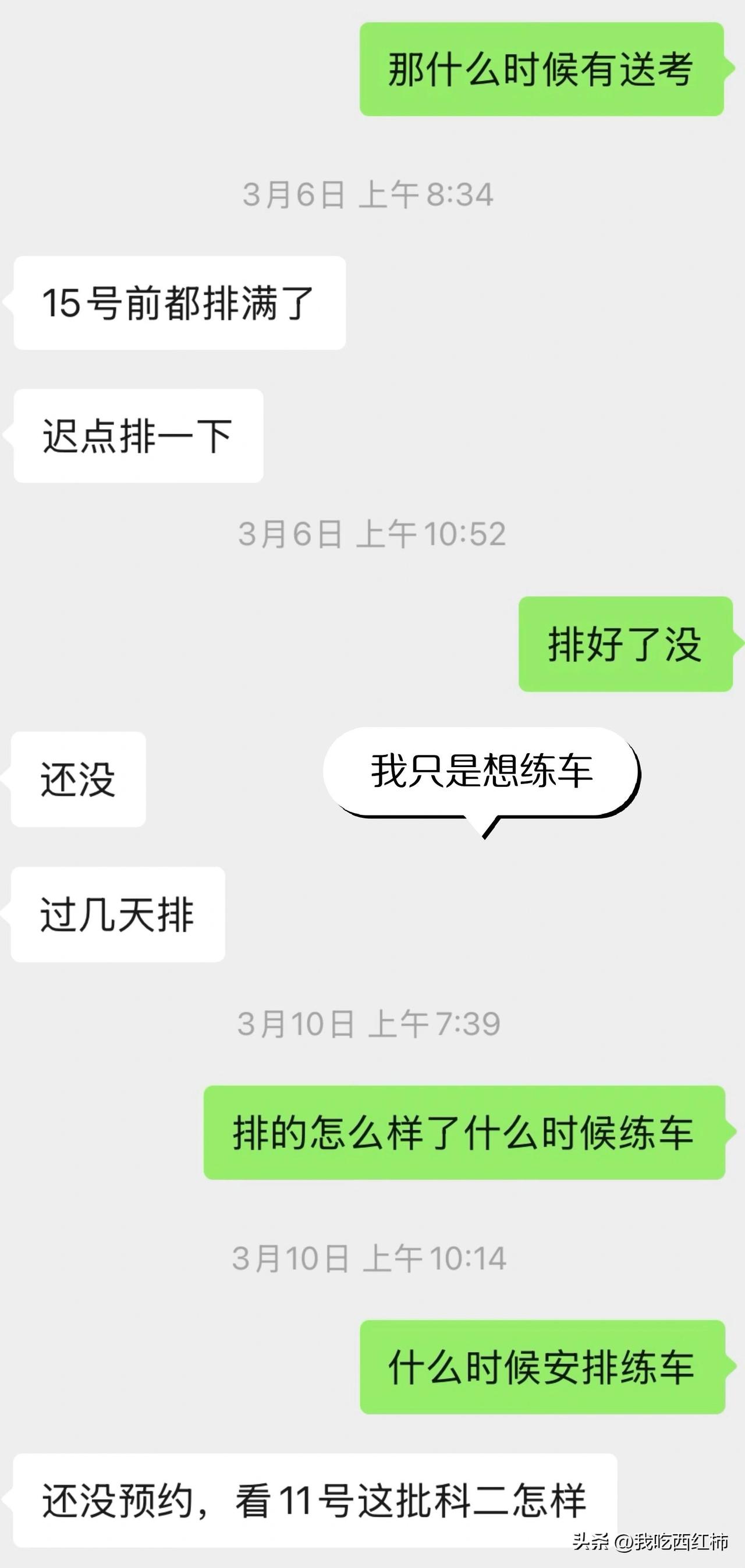 求助!学车遇到这种教练和驾校真的太憋屈了😭 有没有姐妹们学车遇到过这种情况啊!真心求支招! 科三挂了之后,教练就一直不给我安排练车,永远先紧着别人,还让我去迁就别人的练车时间,我完全被动,拖了好久都练不了车,进度一直卡着。(图三、四) 当初报名的时候明明说费用全包,补考费、报名费都包含,结果现在补考费也不退,一直拖着不给解决。(图一、二) 后面想找驾校换教练,驾校却让我私下和教练解决,说我没交钱给驾校而是给教练个人,两边都在踢皮球…微信和教练沟通解决方案,他却说是我要终止培训合作 现在车练不上、补考费不退、换教练也不给换,真的不知道该怎么办了,求有经验的姐妹帮忙支支招,教教我应该怎么维权!