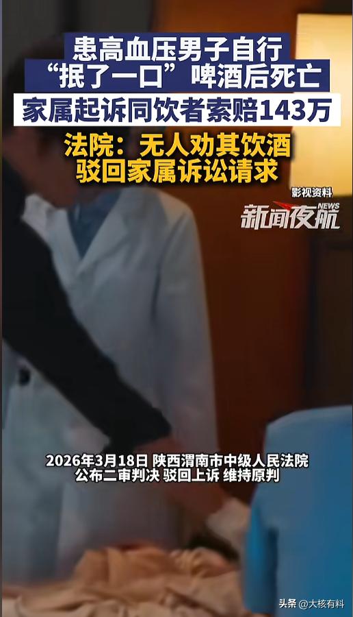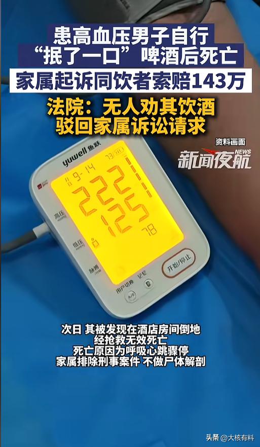 “又是喝酒惹的祸!”3月18日,陕西渭南,当地中级法院二审宣判了一则案件。一男子席间,声明自己喝不了酒,整桌也无人劝酒,可宴会结束时,他自己拿起啤酒“抿了一口”,结果第二天发现在酒店里死亡,家属索赔143万元。法院:驳回! 劝酒是餐桌上的陋习,随着各类劝酒案件的宣传,现在已经没有那么厉害了,但每年因为饮酒发生的事故,还是屡见不鲜,还有些别人没劝酒,自己喝出事来的。 当日,该男子去谈生意,随后参加了聚餐。吃饭前,他向大家声明,自己有高血压,喝不了酒。同桌的人都表示理解,没有再劝,只是自行饮用,酒都没给他倒。 当宴会快结束了,男子为了表示感谢,自己倒了小半杯啤酒,抿了一口。宴会结束后去了酒店休息。第二天,被发现在酒店房间内死亡。医院认定死亡原因为呼吸衰竭,但家属要求不做尸检。 事后,家属将宴会饮酒人员和对方公司告上了法院,索赔143万元。一审法院认为,被告人在此案件中无过错,驳回了家属的诉讼请求。家属不服,选择了上诉。 二审法院同样认为,被告方在案件中没有过错,男子饮酒属于自愿行为,且没有证据证明男子死亡与饮酒有关,因此驳回了原告的诉求,维持原判。 网友看后表示,抿一口啤酒就能导致猝死么?要是真的对酒精这么敏感,当场应该就出事了吧。况且,人家都尊重他的意愿了,酒都没给,最后自己非得要喝,这怪不到别人头上吧? 信息来源:《3月20日(发布)。患高血压男子自行“抿了一口”啤酒后死亡,家属起诉同饮者索赔143万,法院:无人劝其饮酒,驳回家属诉讼请求。》新闻夜航