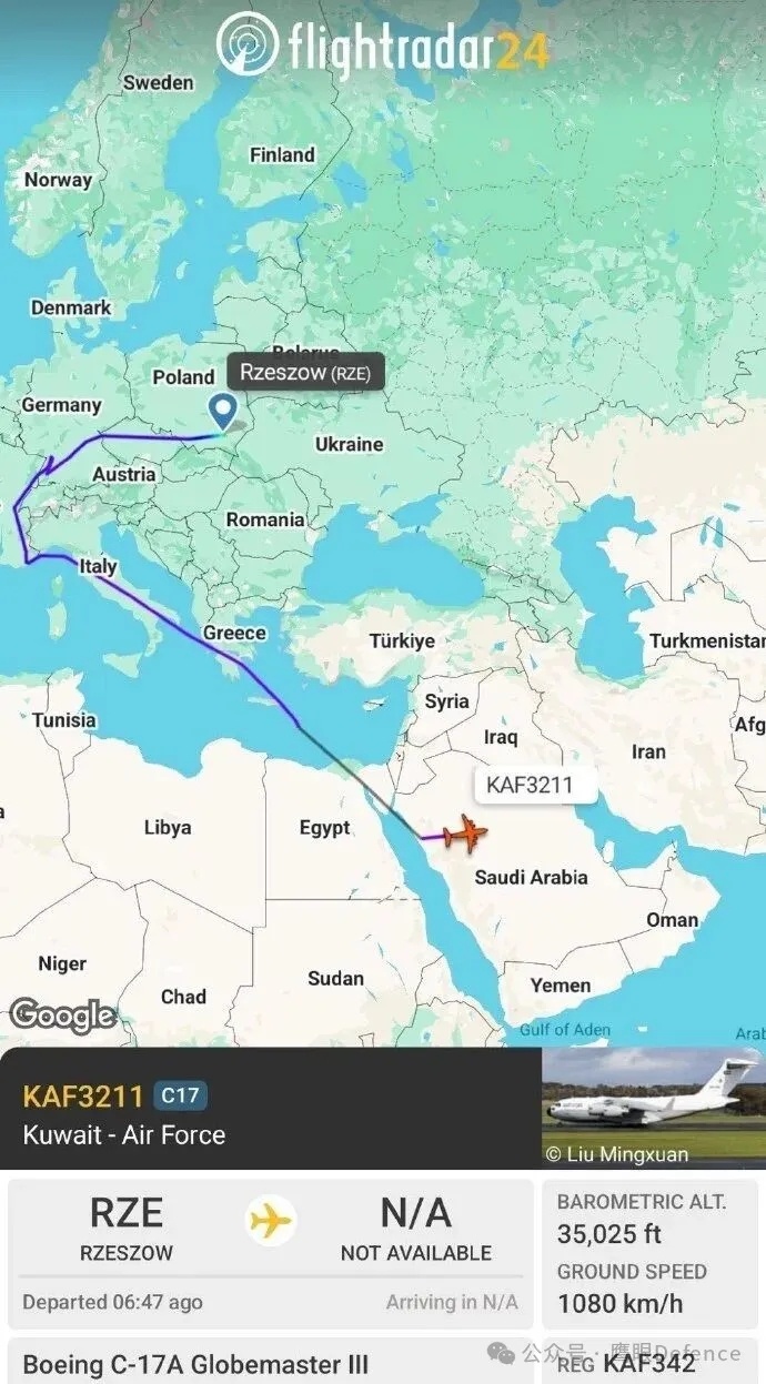 一些中东国家的运输机,诸如科威特空军拥有的美制C-17运输机也被发现往返波兰边境城市热舒夫,那里是支持者们援助乌克兰的关键枢纽,外界不清楚科威特这架C-17运输机运去了什么,又运回了什么。