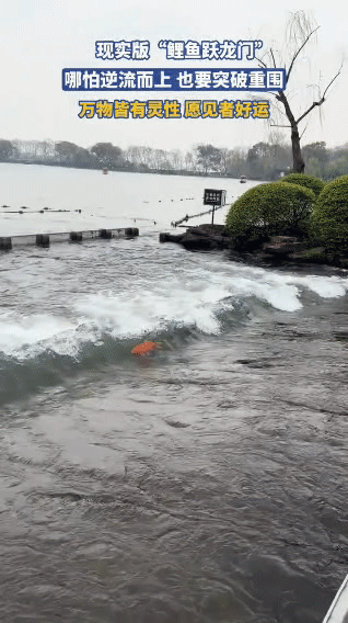 近日,一处景区水域出现了现实版“鲤鱼跃龙门”的场景。 湍急的水流中,一条橙红色的鲤鱼正奋力逆流而上,一次次向着前方的水坝冲击,试图突破水流的阻碍。 岸边聚集了不少游客,纷纷拿出手机记录下这充满生命力的瞬间。 大家感慨万物皆有灵性,也为鲤鱼逆流而上、不屈不挠的劲头所打动,纷纷祝愿见者都能收获好运。 原看到此头条的友友们今年好运连连,身体健康,阖家幸福!红鱼跃水 鲤跃生财 鲤鱼跃龙门