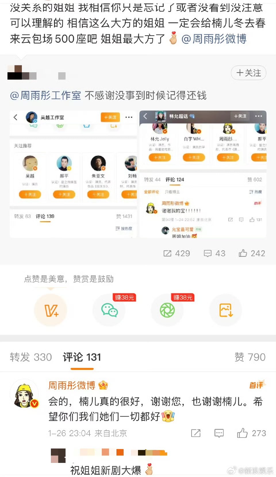 周雨彤给白宇章若楠新剧包场内娱神仙友谊太好磕!章若楠与周雨彤双向包场互挺新作,误会消解后情谊更浓。今晚《冬去春来》开播,白宇、章若楠领衔演绎热血追梦,一起锁定追剧不缺席。