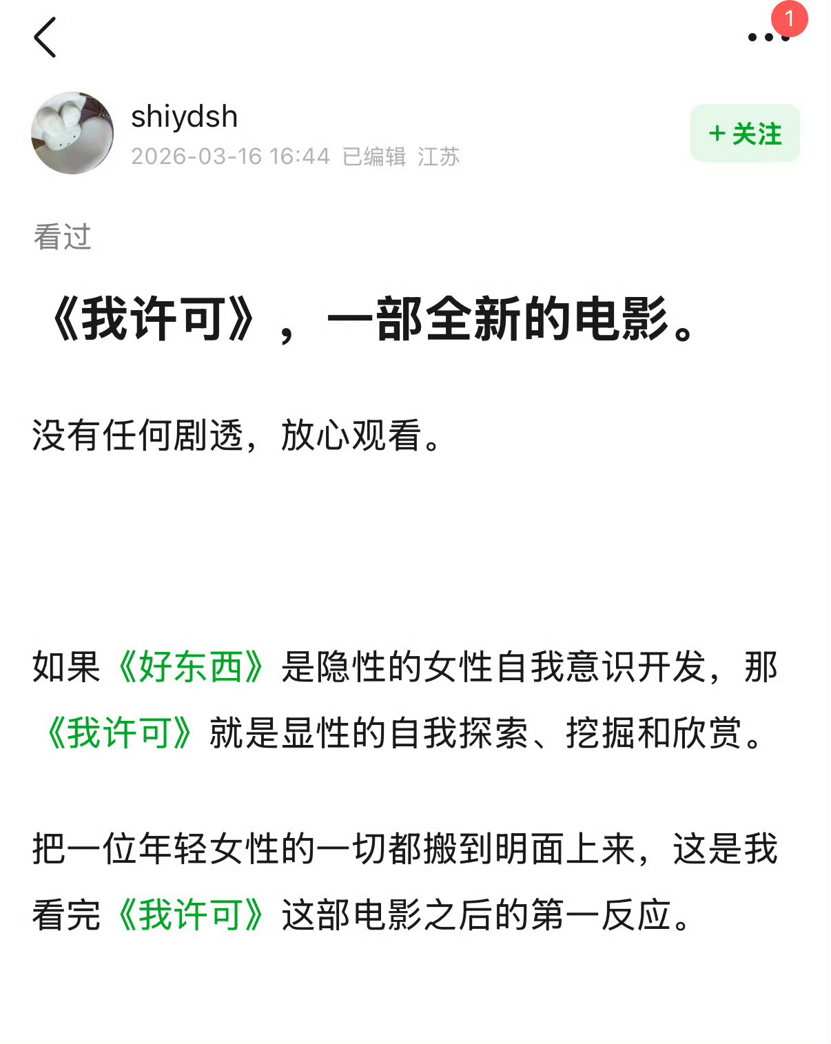 《我,许可》真的太好了太勇敢太珍贵太大胆太直白太精彩了。。看哭好几回,但笑点也很多,节奏很合轻盈舒适,完全可以放松来看。影片讲母女共同体一下子想到去年今日我就在追雁回时母女线…《好东西》,《我许可》,真是好电影。感谢妳们还在创作。