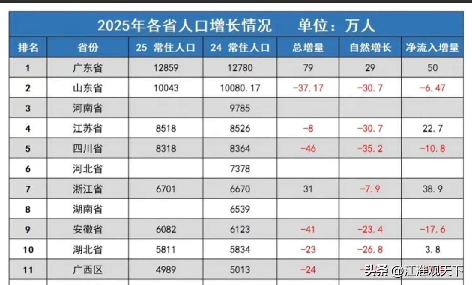 广西人口跌破5000万,中国人口超5000万以上省份缩减至10个 2025年,在讨论各省人口数据时候,很多网友都有个普遍共识,大家都认为广西壮族自治区,大概率在2025年人口会跌破5000万大关。 因为2024年广西常住人口5013万人,比2023年减少了14万人,非常接近5000万关口位置。 结果,大家的预测成真了,根据广西统计部门发布的数据,2025年广西壮族自治区常住人口是4989万人,减少24万人,跌破5000万人口大关。 随着广西退出5000万人口大省行列,目前为止,中国还有10个超5000万人口的省份了,分别是:广东,山东,河南,江苏,四川,河北,浙江,湖南,安徽,湖北。人口数量分布图 广西城市格局 2026人口 广西经济布局 广东广西对比 广西籍人口 广西区划变迁 中国人口地图