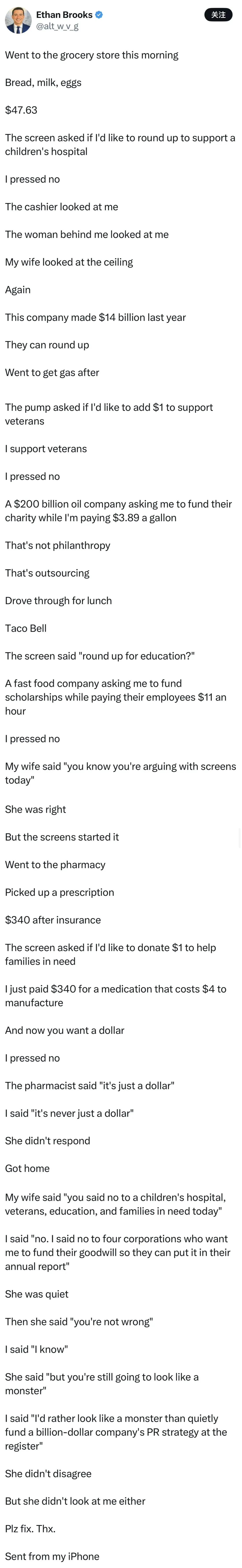 看完这个美国人的吐槽,才知道美国的主要慈善捐款的百分之九十是平民承担的! 那些美国富豪大都是沽名钓誉居多。 这个美国人去加油,付钱的时候加油站工作人员询问能否多付1美元以支持美国退伍士兵,他当场拒绝。 让他捐钱的这家美国石油公司市值2000亿美元,让他捐钱他认为不合理。 这个美国人也说明他不捐钱的原因。 他捐的的钱石油公司收了,捐款是以石油公司的名义,石油公司就能通过拿客户捐的钱免税这部分的额度,所以他不想被资本家利用,所以他不捐钱。 美国的超市,快餐店,油站等等行业都有让客户捐钱支持公益事业的行为。拿客户的钱去捐却用自己公司的名义,难怪这名美国人这么反感。 美国企业就是慷他人之慨给自己落好名声,还能免掉一部分税款,这分明就是利用人们的善良为自己谋利益。 看看美国那些大富豪,整天叫着喊着要把钱捐出去,最后却捐给了自己亲人控制的基金会。 只能说不是这个美国人没有善心,他只是不想被资本家利用而已。