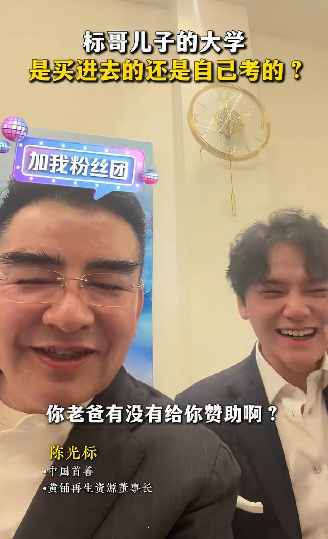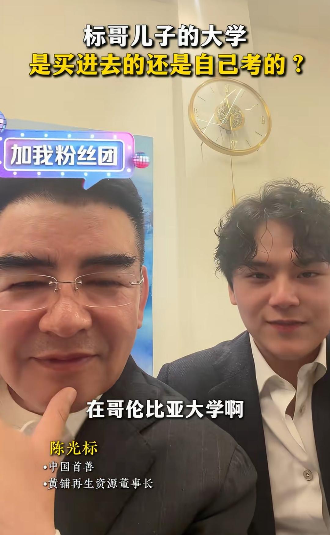 看看国内富豪的儿子,也就是咱们说的富二代。 标哥有两个儿子,大儿子环境,小儿子环保。 第一次见到标哥的小儿子环保,很帅,很有出息,为标哥长脸。 直播间,标哥应粉丝要求,想见见标哥的小儿子环保。 刚好,环保在家,就直接喊儿子出镜见见粉丝。 网友:环保不仅长得帅,而且国语也说得贼标准,声音就像播音主持。 面对直播间粉丝,环保举止落落大方,潇洒自然。 环保介绍自己今年23岁,身高1.83米,目前在哥伦比亚大学读本科大四。 标哥问:本科是你自己考进去的,还是走后门进去的?你老爸有没有给你赞助啊? 环保:当然没有,是我自己考进去的。 标哥:为什么没有呢? 环保:自己能考进去为什么要赞助呀! 标哥:本科能不能赞助进去? 环保:能是能,但要提前三到四年,而赞助费用很贵。 标哥:赞助费用要多少? 环保:要5000万人民币起步吧!我觉得这很奇怪,你有这5000万赞助给学校上大学,还不如不上这个大学。 2014年7月,潘石屹夫妇以SOHO中国基金会名义赞助哈佛大学1500万美元。 2014年10,潘石屹夫以SOHO中国基金会名义赞助耶鲁大学1000万美元。 用途:资助在这两所学校读本科的中国贫困学生。 金星质疑:能自费出国留学的会是贫困学生吗?