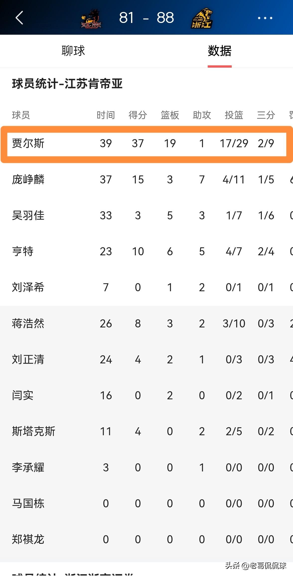江苏肯帝亚外援贾尔斯真是燃尽了!虽然今天江苏肯帝亚在主场以81:88惜败于浙江浙商证券,但是贾尔斯在攻防两端都为球队拼尽全力,真的是燃尽了。 全场比赛下来,贾尔斯首发出战39分钟,投篮29中17,其中三分球9中2、罚球2中1空砍37分19篮板2抢断。 实事求是的说,对于贾尔斯的表现,我相信江苏肯帝亚的球迷是非常满意的。