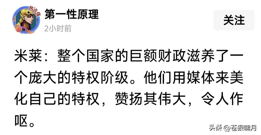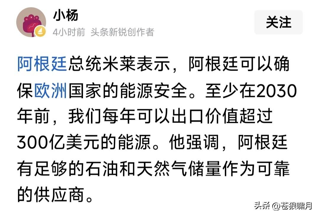 看到米莱两段话,令人不由产生联想!他说:用整个国家的巨额财政,滋养一个庞大特权阶层。他们却用媒体美化这个阶层,溢美之词令人作呕! 他说:当下乱局之下,阿根廷能保证欧洲能源安全!至少2030年前,我们有足够的石油与天然气储量,保证每年能出口300亿美元以上的能源! 他的第一段话什么意思?是说他的前任费尔南德斯?还是讽刺同为南美国家的委内瑞拉、哥伦比亚或古巴?或者是想做“中东霸主”的“教士神权”? 他的第二段话什么意思?是想借美以伊冲突乱局,霍尔木兹海峡混乱不堪,火中取栗趁火打劫,趁机招揽欧洲国家能源生意,助力阿根廷经济吗? 苍狼从米莱第一段话中,读出他的大公无私锐意进取,大刀阔斧进行改革,削减特权阶层利益,为广大底层民众谋福利,摆脱僵化走上发展模式! 苍狼从米莱第二段话中,读出他的精明与经济头脑,如果真能趁美以伊冲突,霍尔木兹海峡危机之机,揽到欧洲能源生意,是阿根廷经济利好啊! …………