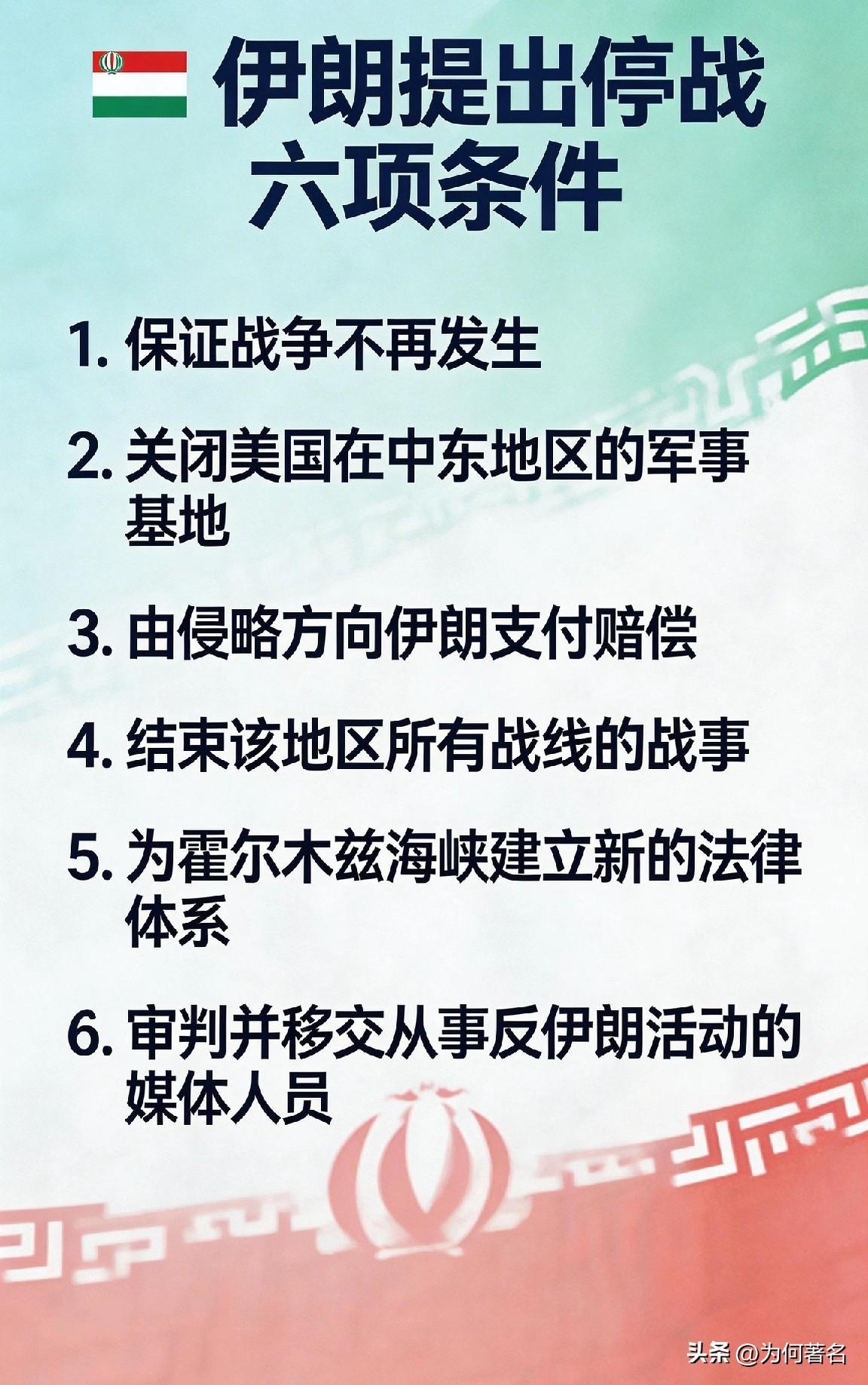 毫无疑问,伊朗赢了 并不是因为伊朗刚刚提出的停战六项条件美国接受了,恰恰是因为时间过去一天了,美国针对此事竟然罕见的 沉默了,没有回应!这事很不特朗普。 回头再看伊朗官员提出的六项条件,即使单一条摆出来,美国都不可能接受。而伊朗这次足足提了六条,看中的就是美国会放着自己的好日子不过,要深陷中东战争的泥潭?那东方大国可就要反超了。 所以美国这次没办法善了,从委内瑞拉的春风得意,到现在的“举步维艰”,每一步都难。 乌克兰能拖住大俄,伊朗同样也能拖死老美,大家说是不是?