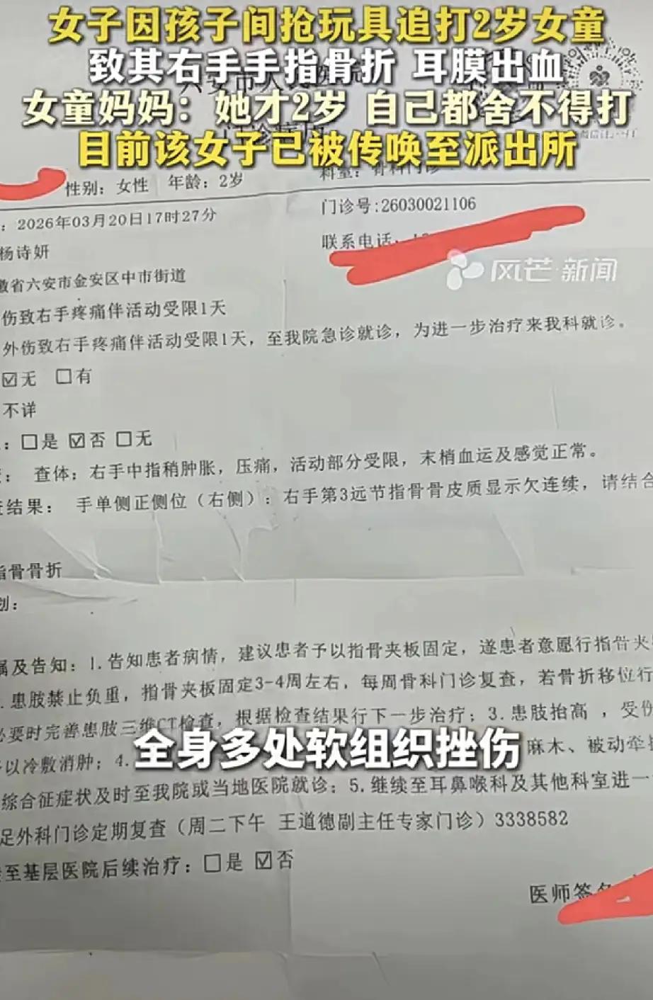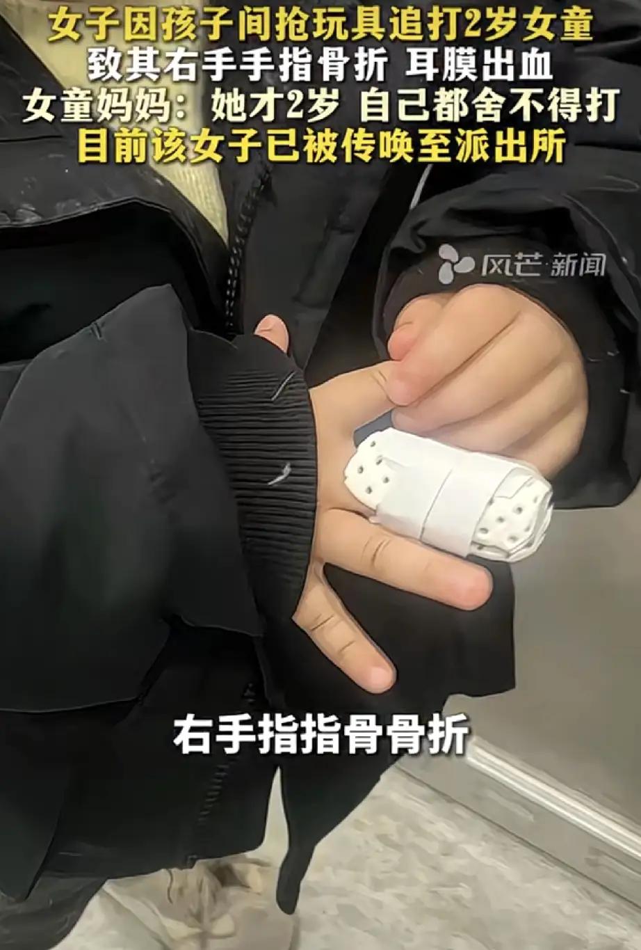 下手太狠了!安徽乐安一女子,因见自家孩子和两岁女童抢玩具车时吃了亏,女子瞬间情绪失控,追着女童大打出手。最终女童耳膜出血,全身多处软组织挫伤,右手指指骨骨折。 事发3月19日,事发饭店监控显示,老板不足两岁的女儿,穿着黑色的棉袄,正在大厅里玩耍她的玩具车,期间一位身穿白色羽绒服的女孩进了店,而女孩进店后,直接上前开始抢老板女儿手里的玩具车。老板女儿为了保护自己的玩具,则出手抓到了白衣女孩。 本是小孩子之间抢玩具的平常打闹,一般做家长的都会哄孩子两句,引导一下就过了的事,结果白衣女孩的妈妈见状后,不但没有好好引导孩子们,反倒是觉得白衣女孩吃亏了,当场暴怒就追着老板女儿打。 可见,老板女儿被打得哇哇大哭时,女子在打,这店内服务员上前劝阻了,女子还是再打,直到老板和老板娘闻声赶来,女子才停手,而老板看着自家的孩子已经哭得撕心裂肺,也是心疼不已。 但当老板质问女子时,女子不但没有一句道歉,还理直气壮的表示,就是为了给自己孩子出气。 事后老板调出监控看到孩子的遭遇后,也是心疼孩子,而更让老板心疼的是,老板带着自己家孩子去医院检查,一番诊断下来,孩子不但身上多处软组织损伤,还右侧耳膜出 血,右手指指骨也骨折了。 面对一位成年女性,如此伤害自家两岁孩子,老板和老板娘觉得非常气愤,目前老板娘已经为女儿报案,明确表示绝不和解! 因为一个成年人是有理智的,绝不该如此暴 力对待一个毫无反抗能力的幼童,所以他们必须对施暴者追责到底!必让其受到法律的严惩!目前打人女子已被警方传唤。 不得不说,打人女子何止下手狠,简直就是“毒”!自己都是当妈妈的人,而且自己的孩子也才这个岁数,怎么忍心对这么小的孩子下如此狠 手?关键是女子事后还没有意识,她的行为对这个孩子造成了多大的伤害!正如网友所说,监控证据确凿,支持被打女童家长追责到底,必须严惩施暴者!