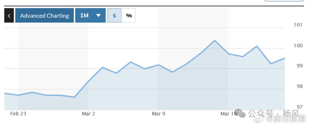 然而这次却打破过去的“惯例”,美元指数虽然上升,但只是微幅上升,从开战前的97.6 上升到昨日的 99.5,上升了 2 个点,只有在中间曾经短暂突破 100,这就尴尬了。
