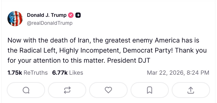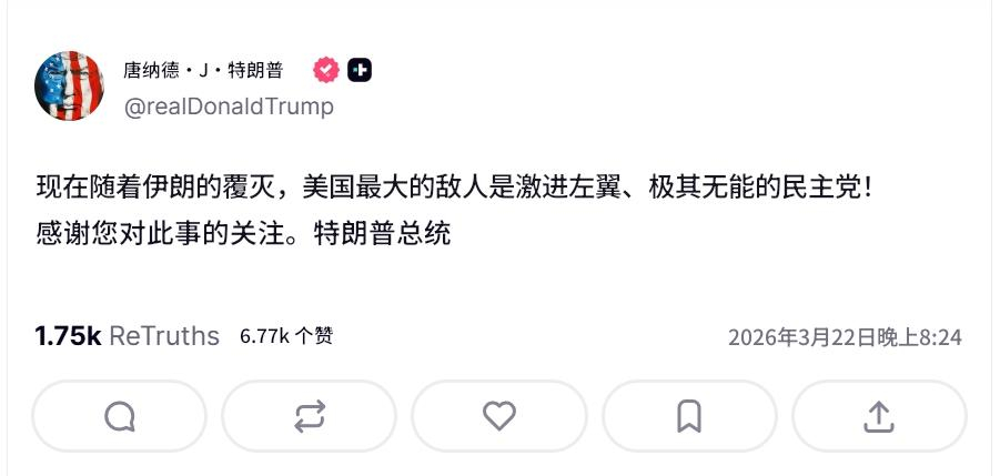 特朗普:随着伊朗的覆灭,美国最大的敌人是激进左翼、极其无能的民主党!