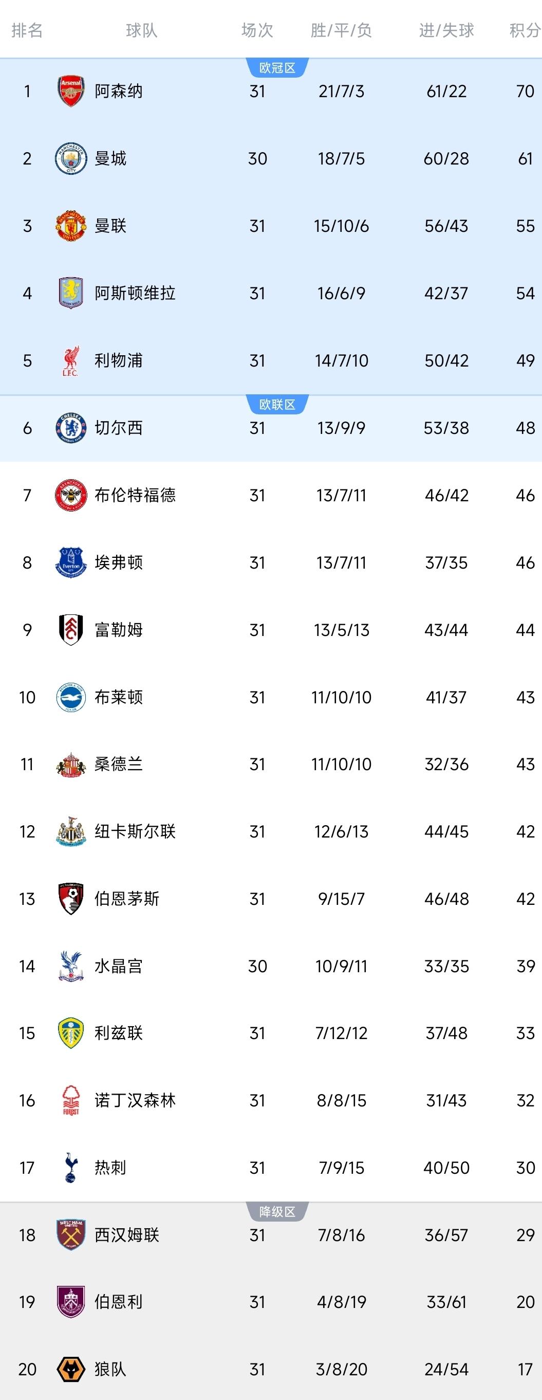 英超一夜最新积分榜出炉! 热刺0-3惨败,排名被森林反超,掉第17名! 维拉稳住欧冠区位置,纽卡惨遭绝杀! 北京时间3月23日,英超联赛第31轮结束三场焦点对决。 ①纽卡1-2桑德兰。 开场10分钟纽卡抓住对面失误,戈登破门占先机,只是随后时间他们未能扩大优势,这似乎埋下伏笔。桑德兰没有放弃拼搏,直到下半场攻势愈发猛烈,第57分钟角球乱战塔勒比进球扳平,接着全力以赴,最后第90分钟流畅转换渗透防线,布罗贝伊近距离两连击打进上演绝杀,2比1翻盘。 ②维拉2-0西汉姆联。 比赛第14分钟弧顶位置配合,麦金兜射入网打破平衡,维拉主场先拔头筹,节奏尽在掌控,只是把握能力一般,沃特金斯禁区造点但VAR介入被取消。深陷降级区的铁锤帮显得无能为力,偶尔的机会也难有建树。 维持继续展开压制,第68分钟沃特金斯补射得手扩大比分,接下来稳扎稳打,保障防线没有出现破绽,2比0顺利告捷,他们没有掉链子,稳住欧冠区的位置。西汉姆联31轮29分 ,仍处于降级区。 ③热刺0-3诺丁汉森林。 做客的森林大部分时间被压制,但阵型足够稳定,没有出现问题,等到第45分钟把握角球,热苏斯头球破僵。热刺真是相当倒霉,其实整体踢得不错,可得势不得分,再加上运气比较糟糕,于是他们上半场0-1落后。 回到下半场森林继续把握机会,禁区小范围的配合打穿防线,第62分钟怀特轻松破门再下一城。热刺的斗志似乎渐渐被打散,接连换人变阵没有奇效,最后阶段再丢一球彻底无望,0比3输掉保级大战,排名被反超。