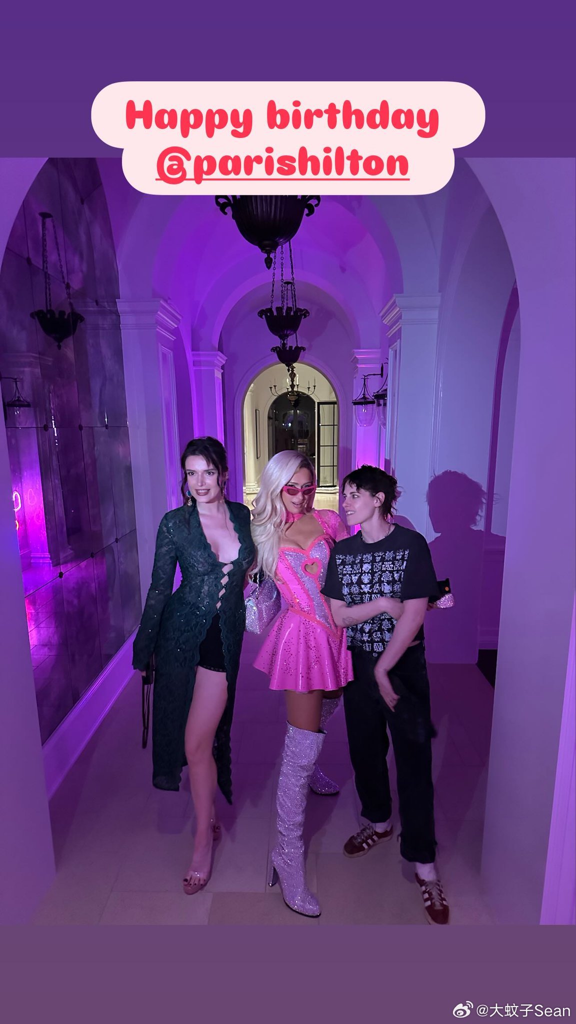 kristen stewart克里斯汀斯图尔特参加Paris Hilton的生日派对,两人与Bella Thorn一起合影