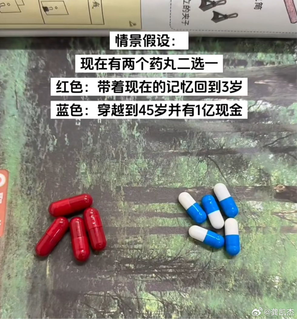 假如世上有这种药丸,二选一你会选哪个?红色:带着现在的记忆回到3岁蓝色:穿越到45岁并有1亿现金