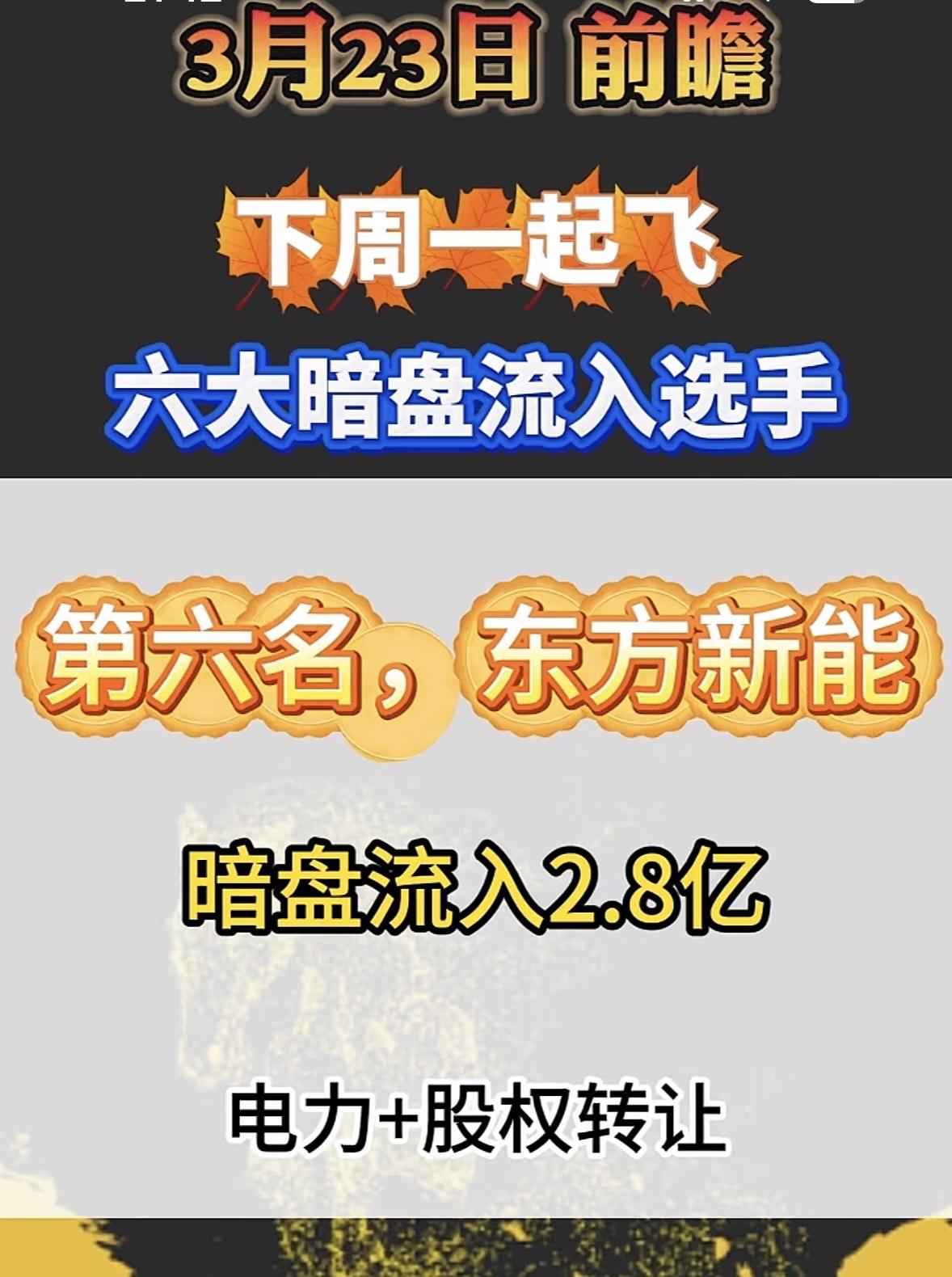 3月16—3月20日本周暗盘净流入前六名个股揭晓。 东方新能源暗盘流入2.8亿,这消息一出来,感觉下周起飞稳了啊!暗盘资金大量流入,往往是行情启动的信号。就像给这只基金打了一针兴奋剂,有很大概率下周一路狂飙。 想想看,2.8亿可不是小数目,这么多资金涌入,肯定是有大机构或者聪明资金提前布局。说不定是他们掌握了啥内部消息,看好东方新能源未来的表现。我已经准备好搬个小板凳,坐等下周它一飞冲天,赚个盆满钵满啦!