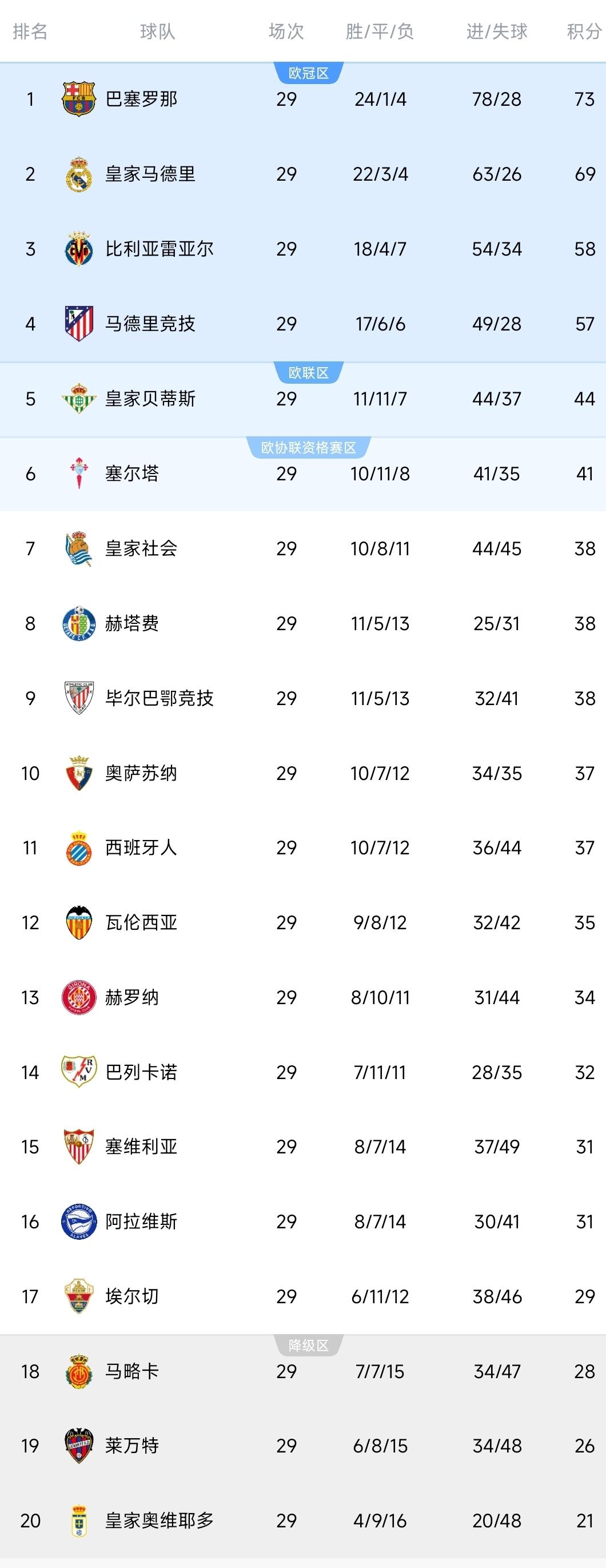 西甲一夜最新积分榜出炉! 皇马3-2马竞,巴萨1-0,西甲前二相差四分。 北京时间3月23日,西甲联赛第29轮的角逐。 ①巴萨1-0巴列卡诺。 比赛第23分钟巴萨把握角球的机会,坎塞洛传中连线阿劳霍头球首开纪录,此后时间全队表现不太理想,进攻很难有实质性突破,防守端又暴露破绽,还好门将加西亚格外专注,屡现神扑,力保球门不失,1比0守住胜利,他们争冠拒绝掉链子。巴列卡诺追赶势头凶猛,接二连三制造险情,可惜一次又一次的空手而归。 ②皇马3-2马竞。 马竞选择防反的战术,前程面对压迫是保持专注,并没给到明显的机会,等到第33分钟他们打出流畅转换,卢克曼近距离推射破门,反客为主。 进入下半场的皇马终于迎来收获,迪亚斯禁区被犯规获点,第52分钟维尼修斯主罚一蹴而就,这显然让队伍的斗志高涨,第55分钟巴尔韦德积极逼抢,禁区断球再终结得手,仅四分钟完成反超。 比赛变幻莫测,落后的马竞作出改变,主教练西蒙尼的换人见效,第66分钟莫利纳轰出一脚远射世界波强势扳平。皇马同样调兵遣将,第72分钟阿诺德连线维尼修斯内切破门,眼看再度取得领先,却不曾想第77分钟巴尔韦德严重犯规领到红牌,还好没有酿成大祸,接下来的时间全队众志成城,守住3比2的结果。