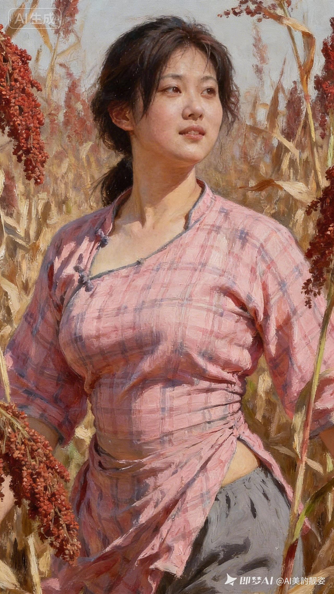秋日田野里的少女,粉裙飘飘,与丰收的稻穗相映成趣。