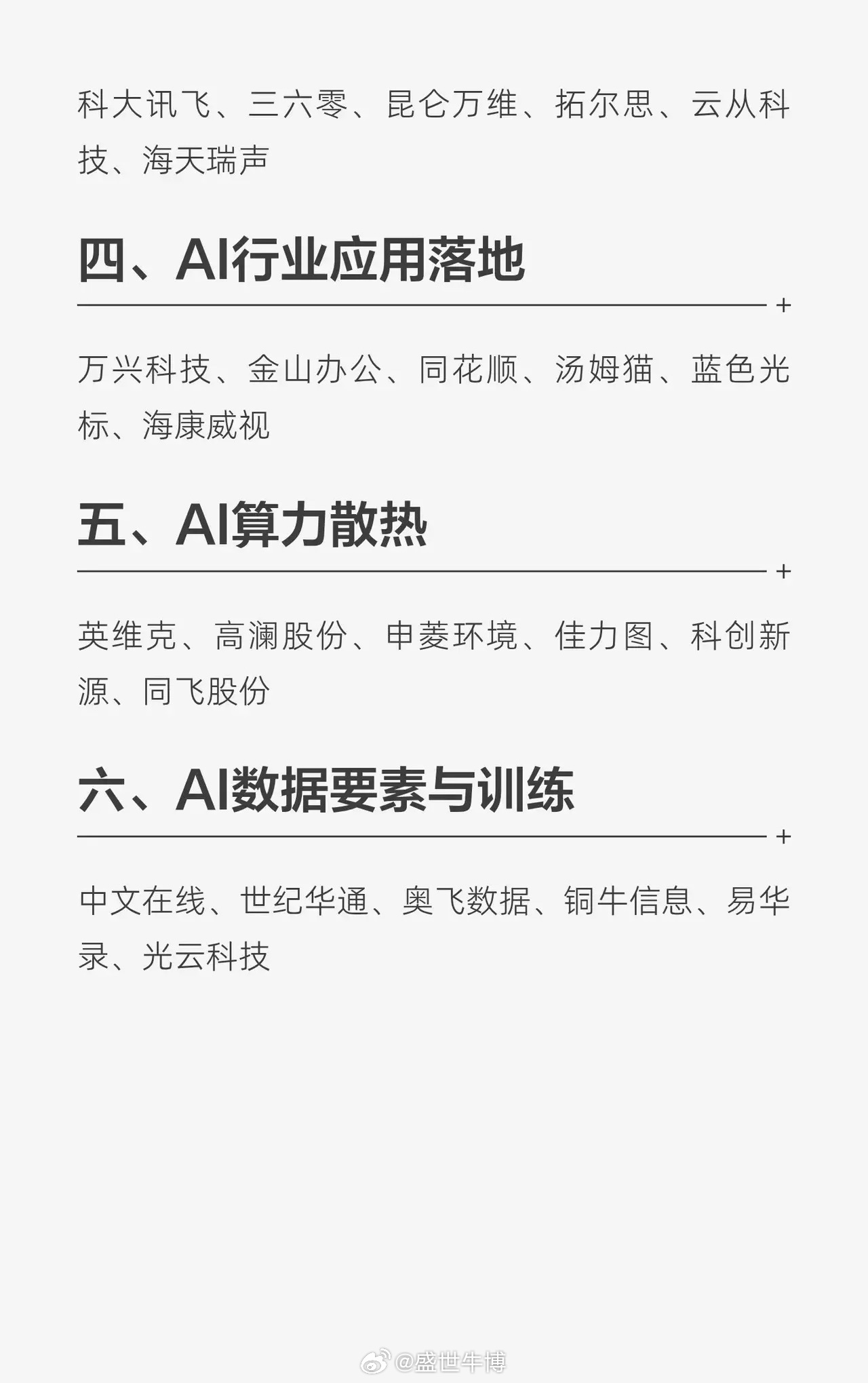 AI产业链六大赛道,收藏备用一、AI算力芯片寒武纪、海光信息、景嘉微、龙芯中科、国科微、芯原股份二、AI算力基础设施浪潮信息、中际旭创、新易盛、天孚通信、工业富联、中科曙光、澜起科技三、AI大模型与算法科大讯飞、三六零、昆仑万维、拓尔思、云从科技、海天瑞声四、AI行业应用落地万兴科技、金山办公、同花顺、汤姆猫、蓝色光标、海康威视五、AI算力散热英维克、高澜股份、申菱环境、佳力图、科创新源、同飞股份六、AI数据要素与训练中文在线、世纪华通、奥飞数据、铜牛信息、易华录、光云科技
