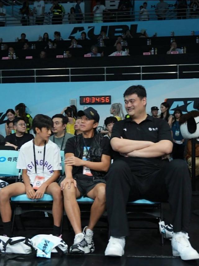 邓超带儿子等等与姚明一起看篮球联赛时的合照:瞧,英俊帅气的等等眼睛直勾勾地看着大块头姚明,这眼神分明写满了崇拜与敬慕哈!