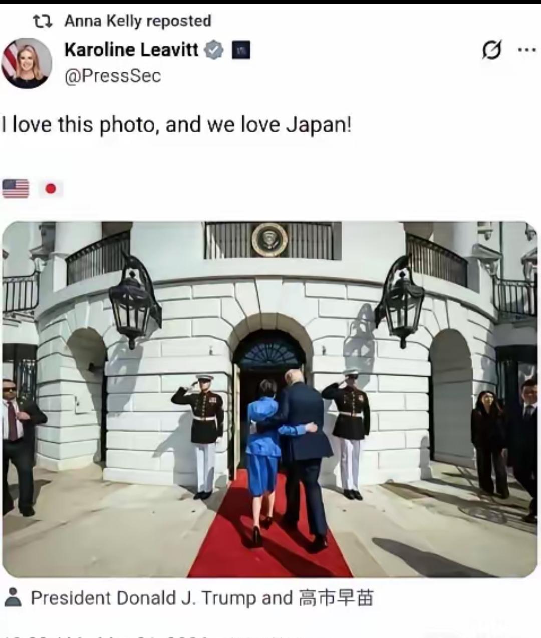 白宫美女发言人卡罗琳,发布了一张照片,特朗普和高市早苗互相搂着对方的腰,一起往白宫大厅走去,卡罗琳还说她很喜欢这个瞬间。说白了,高市早苗在白宫上演的搂腰同行,把日本政坛的依附姿态和双面做派摆到了全世界眼前。 这场搂腰秀开始前,高市在白宫会谈时想用英语套近乎,结果说得磕磕巴巴,特朗普直接打断说“这里有优秀的口译”,场面相当尴尬。 会谈中特朗普还拿珍珠港事件开涮,说“没人比日本更懂偷袭”,高市坐在旁边只能尴尬地睁大眼睛,连话都接不上。 日本国内对高市这次的表现很不满意。白宫官网上传的照片里,她跳舞、咧嘴、缩脖子的样子让日本网民直呼“羞耻”,有人骂她像“中年应召女郎”。 日本砸下的真金白银不少。为了换美国关税优惠,承诺了5500亿美元投资,已经落实了1090亿美元,但利润分配是回本前五五开、回本后美国拿90%。 霍尔木兹海峡护航这事上,高市被逼得两头为难。答应派兵违反日本宪法,不答应又怕得罪美国,最后只能含糊其辞说“在法律范围内研究”。 就在高市访美同一天,东京国会议事堂前聚集了上万人抗议,举着“不允许派遣自卫队”“反对战争”的牌子,要求她别在安全问题上瞎搞。 这场外交秀说白了就是日本花钱买美国一个搂腰合影,高市以为这是“高光时刻”,但在外人眼里,这就是一场卑微的表忠心表演,除了让日本人觉得丢脸,啥也没换来。