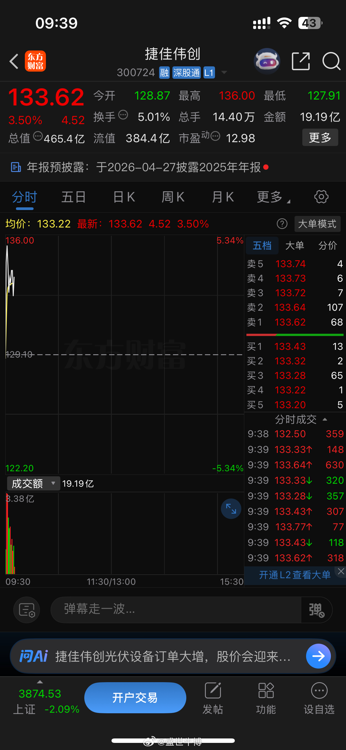 行情越差越能体现我的实力,上周五尾盘低吸捷佳伟创,今天就给惊喜,行情果然没辜负耐