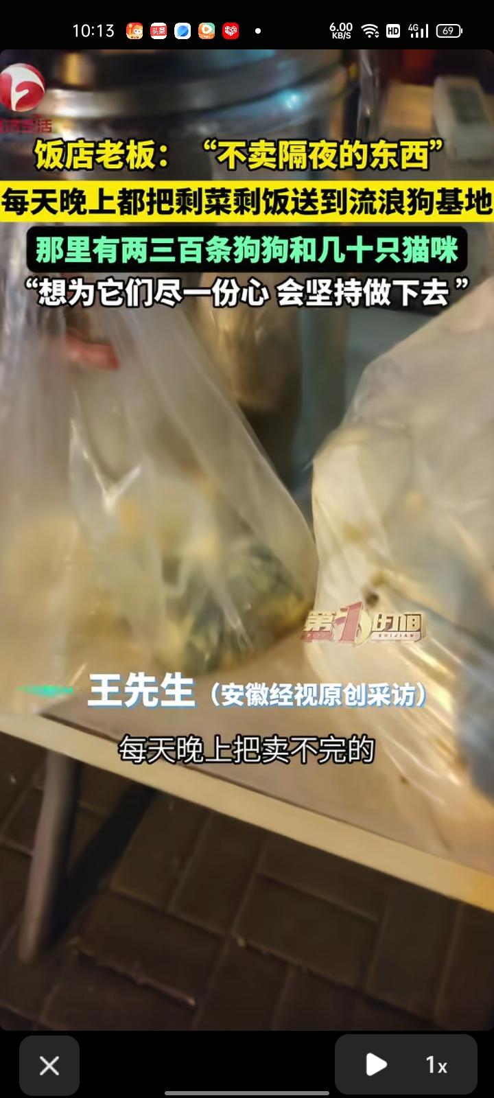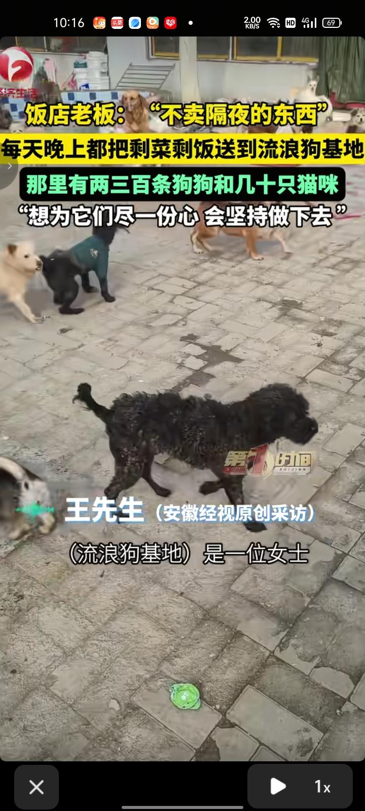 3月23日,河南洛阳。饭店老板声称不卖隔夜的东西,每晚都把剩菜剩饭都送到流浪狗基地,路程花了半个小时和一些油钱,已坚持十来天。流浪狗基地里,有位女子养了两三百条狗和几十只猫,为流浪狗和猫奉献出力量,一切都值得。