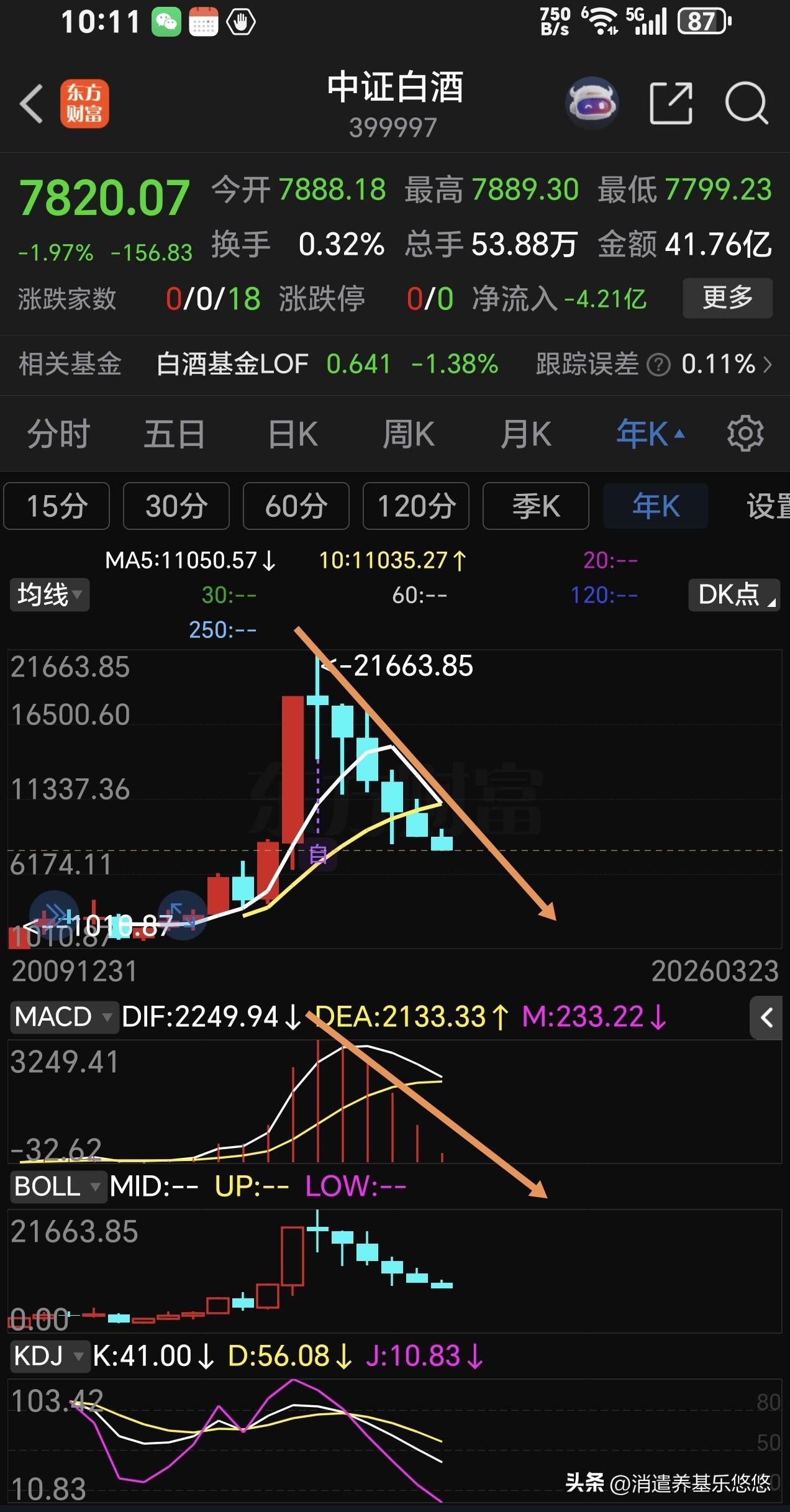 中证白酒原来预判它有可能在7200点附近止跌回稳,现在看来还是高看它了。下图二是它的年线走势图,各项技术指标都在走弱,即将进入死叉状态,探底之路遥遥无期,去年跌一年,今年还有可能再跌一年。中途有反弹就减仓跑路,不要对它抱有幻想,否则伤害太大。