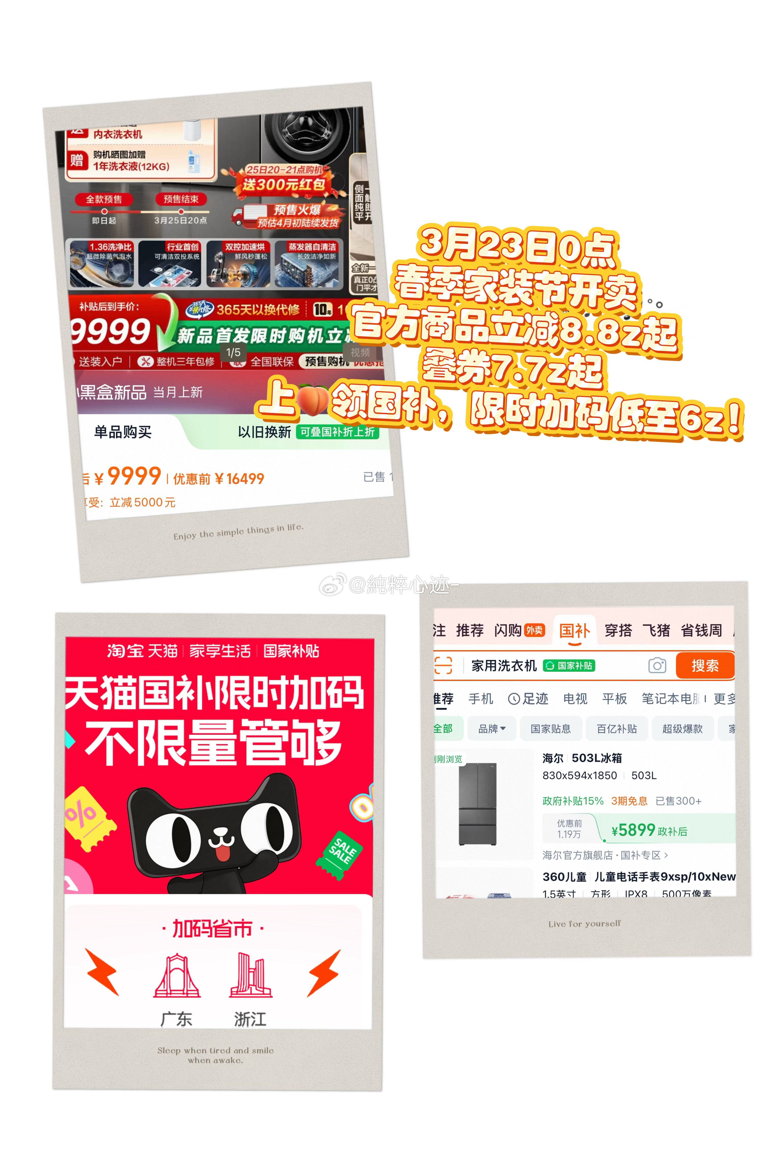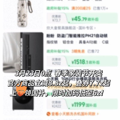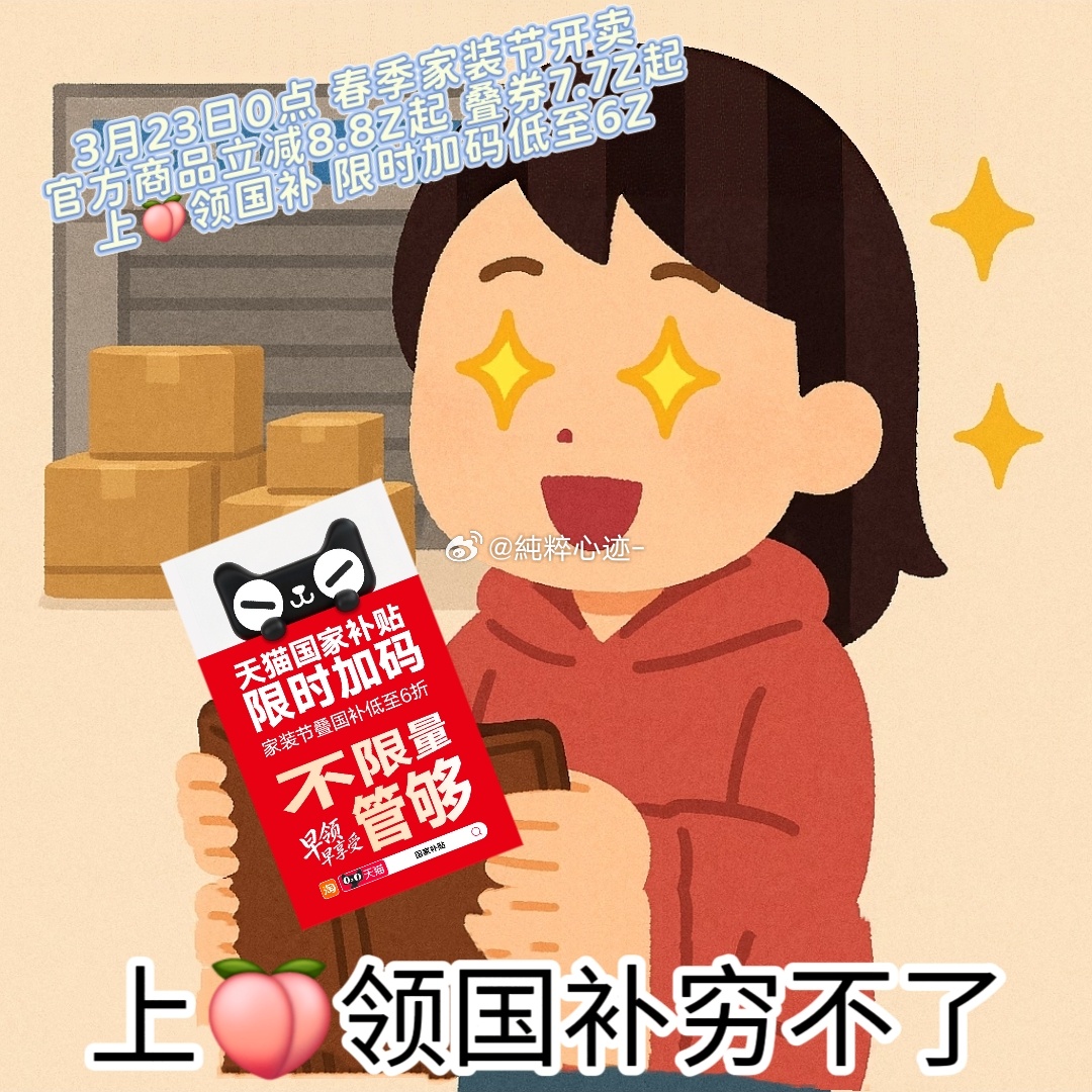 上淘宝领国家补贴3月23日0点,春季家装节开卖!官方商品立减8.8折起,叠券7.7折起,上🍑领国补,限时加码低至6折,多省份国补力度只增不减,天猫以旧换新超划算。 天猫以旧换新多省份国补力度只增不减