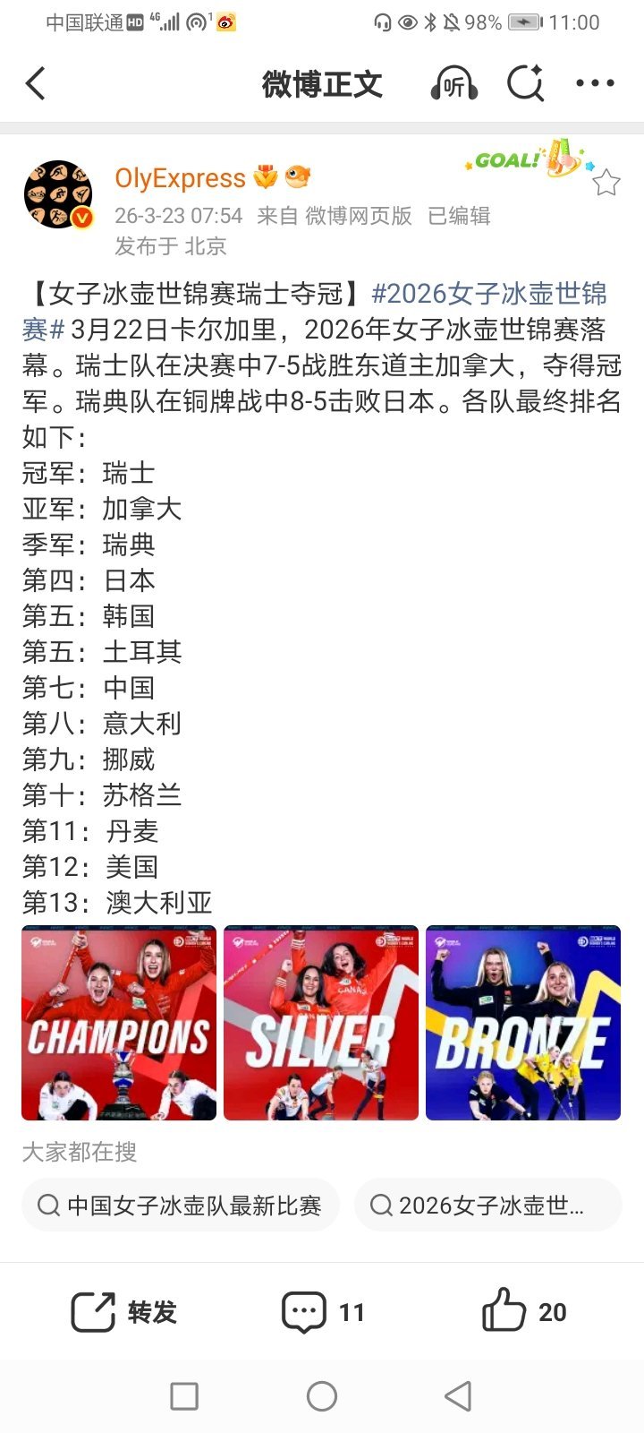 2026年3月23日-2026世界女子冰壶锦标赛铜牌赛 瑞典8-5日本(瑞典女队