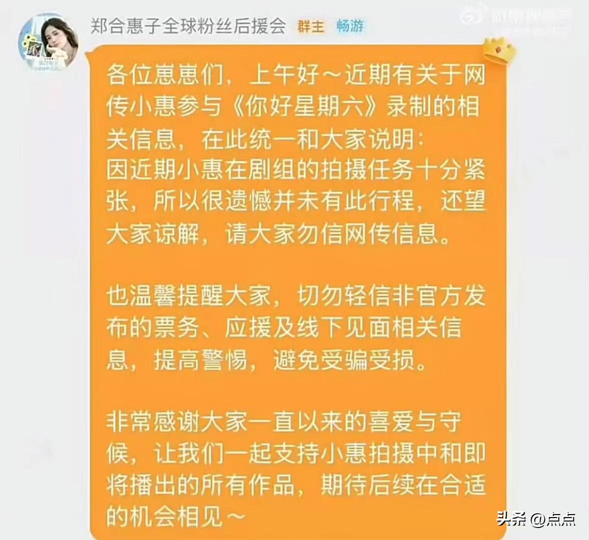 郑合惠子为拍戏缺席女主剧Hi6宣发 敬业与曝光引网友热议 郑合惠子因进组拍摄《将门独后》档期冲突,无法协调出假期,最终遗憾缺席了自己担任女主的新剧《你是迟来的欢喜》在《你好星期六》的关键宣传活动。 这一情况也引发了网友与粉丝的不同看法,部分粉丝对此表示不满,认为其工作团队未能尽力协调档期,白白浪费了此次难得的重要曝光机会。与此同时,也有不少网友持不同观点,觉得郑合惠子坚守拍摄合约、踏实扎根剧组拍戏,是演员恪守本职、敬业负责的表现。
