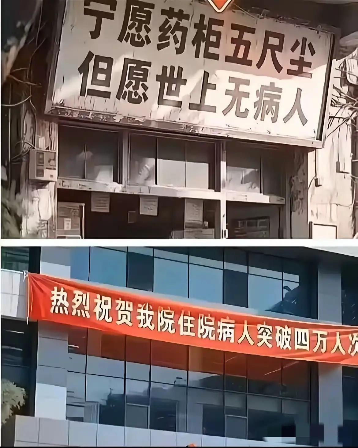 前段时间一家医院在大门上方醒目的挂着这样一个横幅!热烈祝贺我院病人突破四万人次!什么时候医院把病人的入住院率这么明目张胆的昭告天下了!如果没有病,谁愿意去医院! 现在我们普通人去医院都有一种恐惧!特别是一些慢性病,还有癌症!高昂的医药费,轻则让普通家庭欠下巨债,重则卖车卖房,家破人亡! 有时候真的很怀念我们那个年代!我们那个年代的医生是真的很有良知!他们从心底里希望你们不要来医院!宁愿药柜五尺尘,但愿世上无病人! 医院是一个神圣的地方,救死扶伤是他们的职责和使命!不应该把病人的入院率当作医院的考核,更不应该把它当成一种荣耀!这样的真的会让百姓寒心!