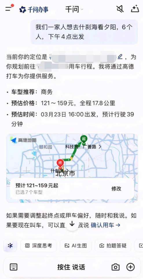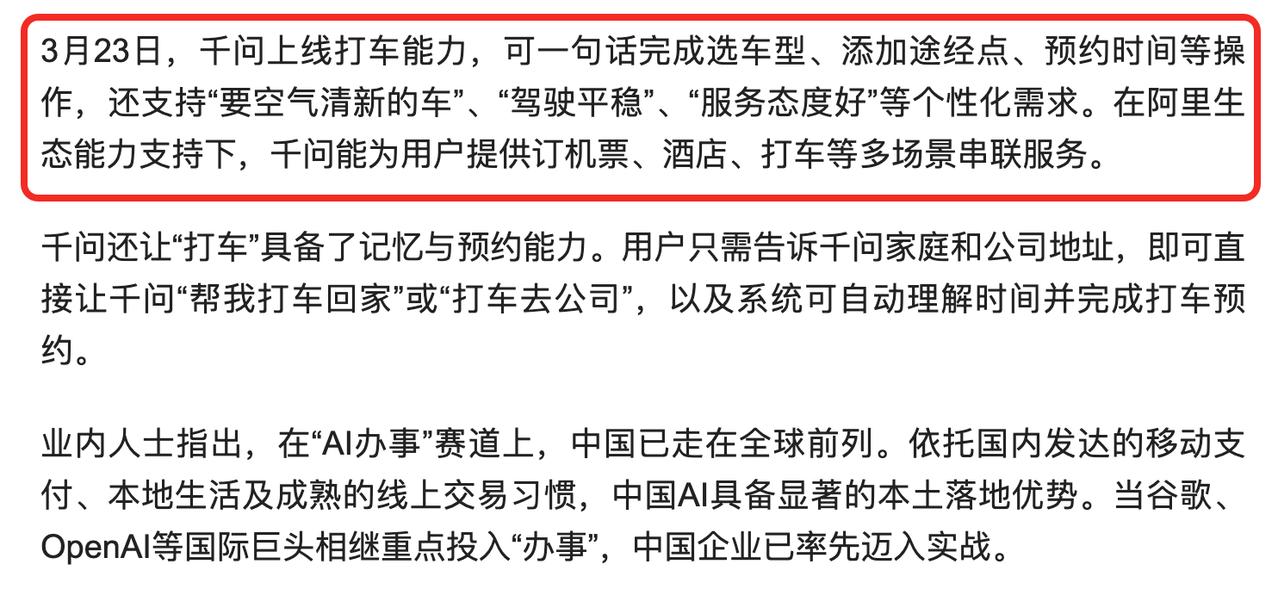 手机弹出一条消息,千问又有新动向,越看越不简单! 看到新闻,千问上线了AI打车的能力。仔细看了下,这个“AI打车”不简单。 复杂需求说出来,不用像过去一样,在软件之间点来点去。 你对着千问说一句“今天下午6点下班,帮我叫一辆最便宜的车回家”。千问就帮你搞好了一切,等待你下班。 这个AI应用的背后,有一个很重要的逻辑是,千问能够真正理解人类在现实生活中的真实需求,并且很好的执行完成需求所需要的步骤。 毕竟打车需要涉及到的东西太多了,比如时效性,比如途径点,比如路线选择等东西,人的眼睛能一下看到地图情况,而AI则需要去像人一样思考甄别才行。 国外的科技公司也在探索这方面更多的可能性,但还没有做到像千问这样落地,可以通过一句话搞定复杂程序的水平。如Google Gemini加紧已能通过语音叫Uber、点外卖,但它还需要人去APP一个个点才行。 很显然,在AI办事方面,当海外的科技公司还停留在尝试阶段时,中国千问是已经落地推进了。 能做到领先,说白了还是因为在AI应用这条路上,中国的公司技术更强! 这个AI打车功能千问能做到,充分体现了其背后技术的先进性。在阿里生态能力支持下,千问还能为用户提供订机票、酒店、打车等多场景串联服务。 也希望千问能继续坚持这种实事求是的办事能力,为普通人提供更多的便利!
