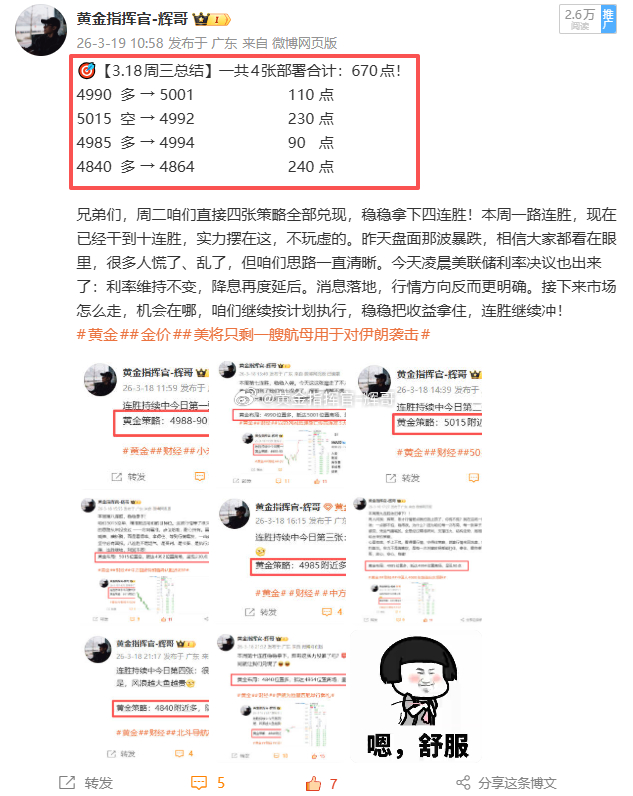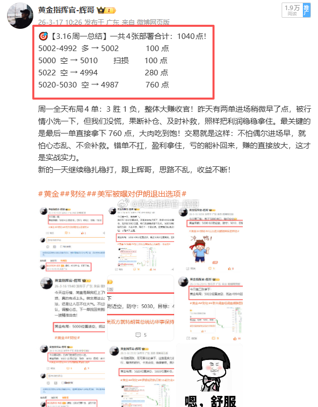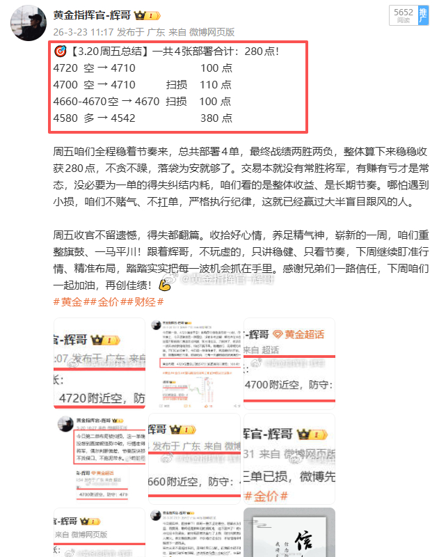 本周全程实战落地,3 月 16 日到 3 月 20 日,一共部署21 张:16 胜 5 负,整体拿下2320 点盈利!全程实打实布局,没有半点水分,这就是咱们盯盘、布局、执行的硬实力!整周下来,咱们不追涨杀跌、不赌气扛单,严格跟着节奏走,最终整体拿下2320点盈利,每一点都是实战落地、稳稳落袋的成果,不是靠运气碰来的。操作从来不是追求百分百全胜,5笔亏损都是可控的小止损,咱们亏得明白、赚得踏实,严控风险的前提下,把收益牢牢攥在手里,这才是长久收益的路子。