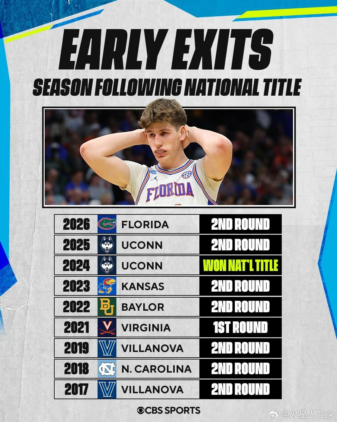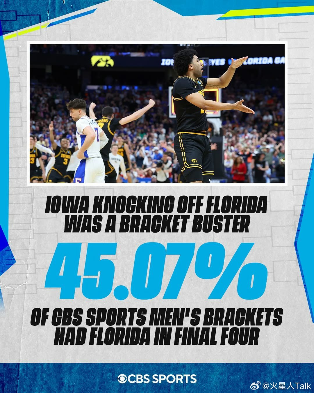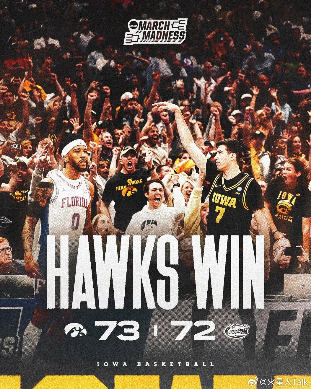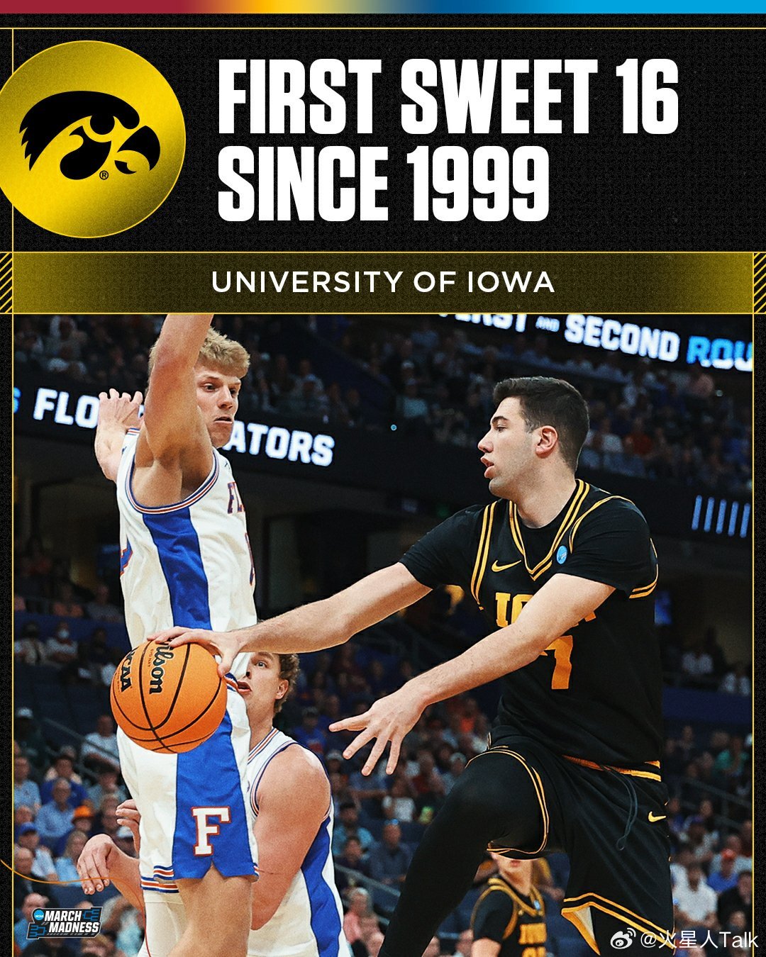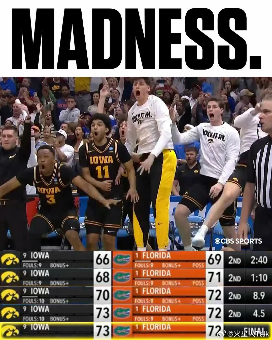2025-2026赛季NCAA男篮疯狂三月 南区第二轮爱荷华大学击败卫冕冠军佛罗里达大学,菜鸟主帅Ben McCollum带领球队自1999年以来首次进入甜蜜16强。鳄鱼成为本赛季首支回家的1号种子球队,看不懂最后一攻打的什么,Lee突的深传的低,即便队友接到,所剩时间能完成出手吗?鹰眼Tavion Banks10中7,20分6篮板。Bennett Stirtz16中5,13分5篮板5助攻。Cooper Koch7中4,12分。替补西班牙球员Alvaro Folgueiras命中关键空位三分球,5中3得到14分5篮板。鳄鱼Alex Condon13中8,21分5篮板7助攻。Thomas Haugh11中3,19分6篮板2抢断。Xaivian Lee11中7,17分3篮板3助攻2失误。Boogie Fland7分4助攻3失误。