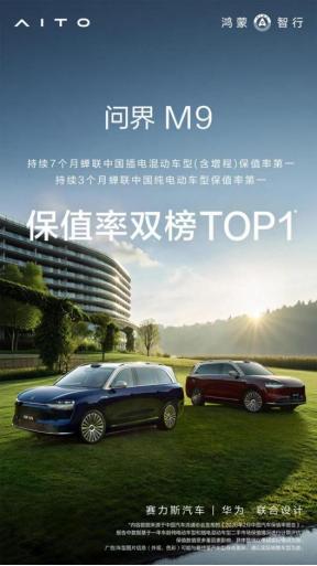问界 M9 再传捷报!在中国汽车流通协会发布的 2026 年 2 月保值率报告中,问界 M9 拿下增程混动、纯电动车型双榜第一,已连续 7 个月稳坐插混车型保值率榜首、3 个月蝉联纯电车型第一。新车搭载华为乾崑智驾 ADS 4 与 896 线激光雷达,拥有双超五星安全认证,累计交付突破 28 万辆,是 2025 年 50 万级豪华 SUV 销量冠军,用销量与保值率双重印证产品实力。
