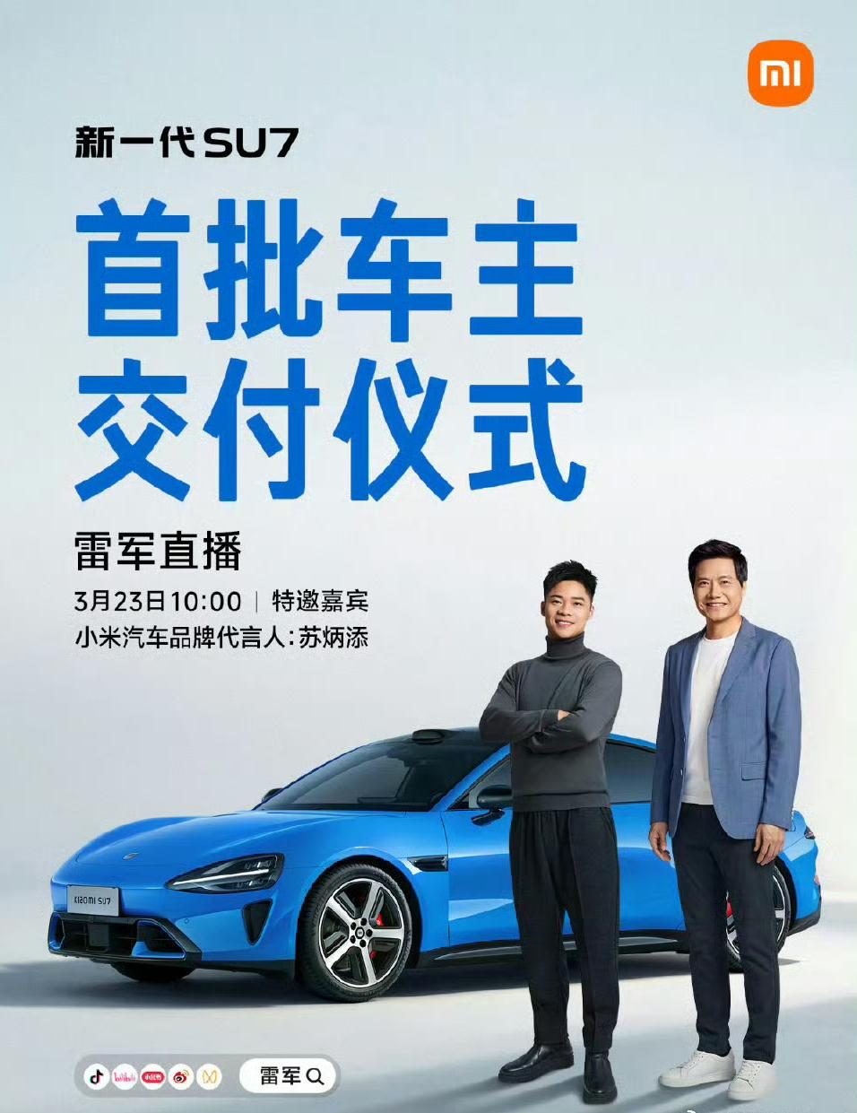 小米新一代SU7正式开启交付! 今天上午,小米汽车在深圳举行新一代SU7首批车主交付仪式,雷军亲自驾车载品牌代言人苏炳添亮相现场,为首批车主开启车门并交付钥匙,该仪式还同步线上直播。 看来新一代SU7交付效率确实提升了很多,上周四才上市发布,今天就开启交付了。 听说小米这次为了提升新车的交付体验,新一代SU7提前两个月就准备大规模量产了,还准备了一批准现车,就是为了让用户早日开上新车。 刚刚过去的上周末,也是小米新车发布后的首个周末,小米汽车门店相当火爆,迎来了试驾和看车热潮,而且大部分都是来试坐试驾新SU7的。 这丝毫不让人意外,毕竟第一代SU7直到停售都是中大型纯电轿车的销冠,更不要说新一代SU7在配置上进行了全面提升,补齐了大部分短板,产品力日趋完善,直接接过销冠的接力棒也是理所当然! 而且,更重要的是在一系列重磅升级之下,新车的价格基本没什么变化,几千块的涨价相比配置上的升级,简直不值一提,性价比是越来越高了! 当然,一般人首先看的肯定还是标准版,如果换新车的话,感觉还是标准版+科技舒享套装的搭配最划算!