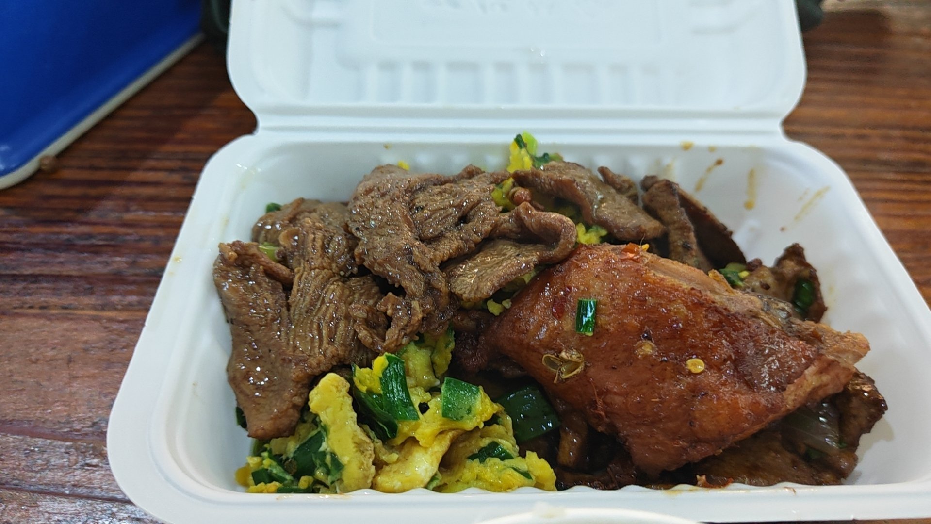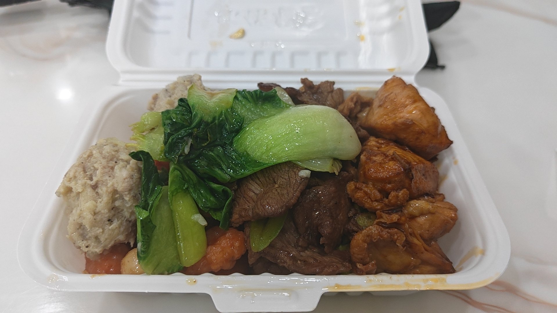 这顿饭的含金量,全靠外卖盒撑场面了。牛肉炒得比我的工资还硬,青菜绿得像刚从冰箱里