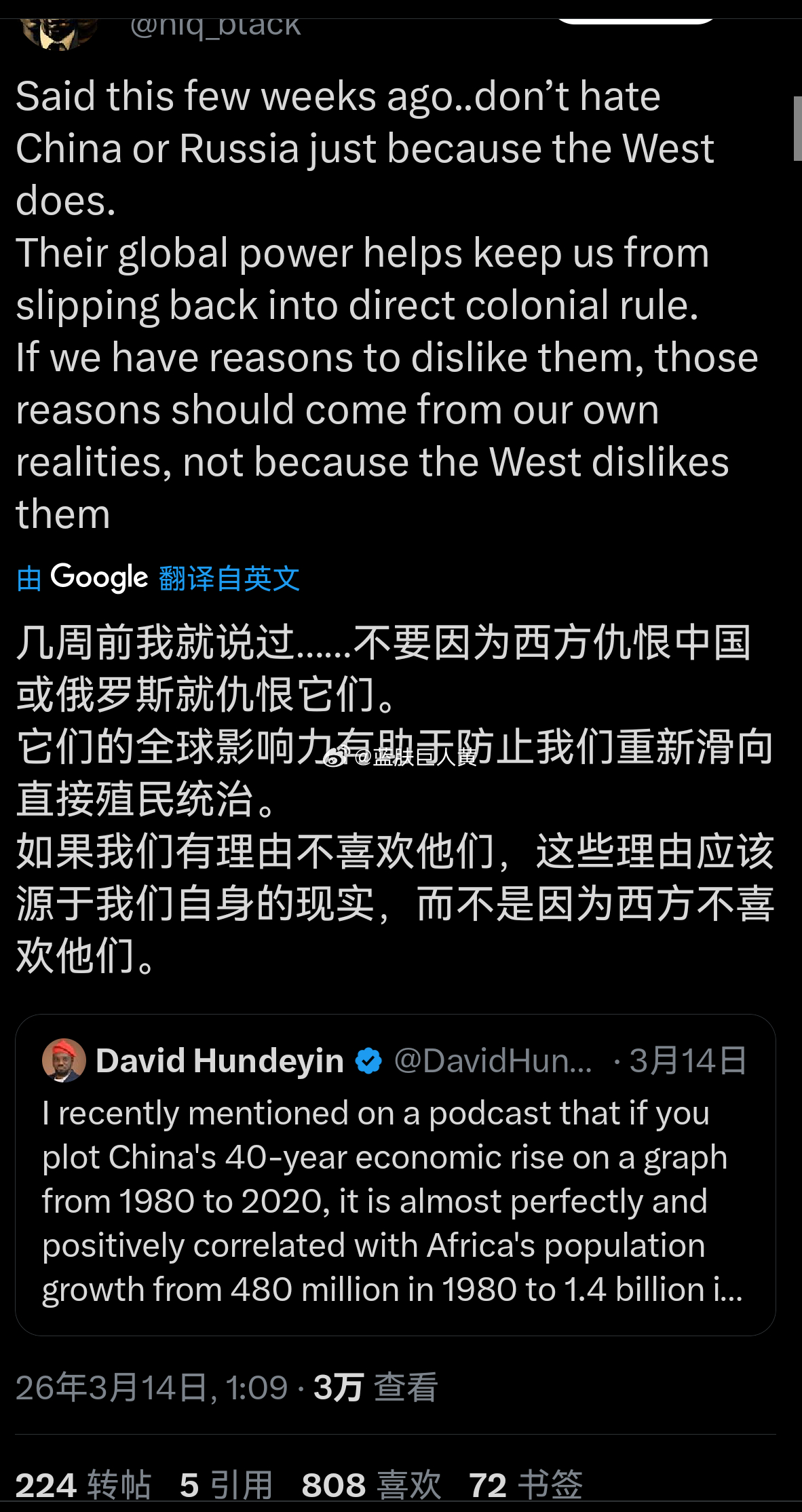 非洲记者在推特上指出:是中国的经济崛起带来了非洲人口大幅增长,避免了非洲被重新殖民!