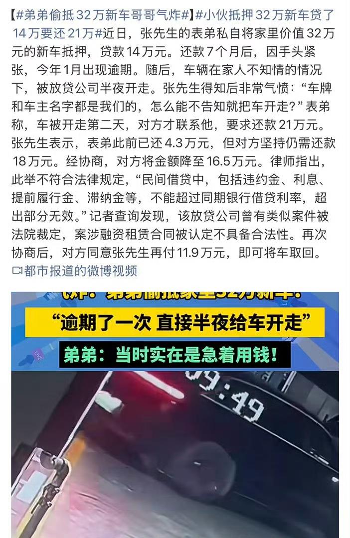 气炸!弟弟偷把家里32万新车抵押,贷14万要还21万,半夜车被拖走🚚 家人们,真的被这弟弟气笑又气炸!好好的32万新车,说抵押就抵押,哥哥全程被蒙在鼓里,最后车没了还要多还钱,这操作简直离谱到家! 河南张先生家刚买的新车,全家宝贝得不行,结果表弟急用钱,瞒着所有人偷偷把车抵押,到手14万。本以为按时还款就没事,谁料还了7个月手头一紧逾期,放贷公司更绝,半夜悄咪咪把车开走,连个招呼都不打! 车主是哥哥的名字,车也是家里全款买的,凭啥不通知就拖车?更坑的是,已经还了4万多,对方张口就要还21万才能赎车,贷14万要还21万,这利息高得吓人,妥妥的借贷陷阱! 哥哥知道后直接气炸,一边是不懂事的弟弟闯大祸,一边是不讲理的放贷公司,好好的家被搅得鸡犬不宁。这事也给所有人提个醒,千万别碰非法借贷,遇事一定要跟家人商量,别一时糊涂坑了自己还连累全家! 现在车被拖走,钱还要多还,弟弟肠子都悔青了,哥哥更是又气又无奈。遇到这种不靠谱的亲戚和黑心放贷,真的太糟心! 弟弟偷抵32万新车哥哥气炸 小伙抵押32万新车贷了14万要还21万 远离非法借贷 家庭那些事 大家身边有这种闯祸的亲戚吗?遇到高利贷拖车该咋办?评论区聊聊!