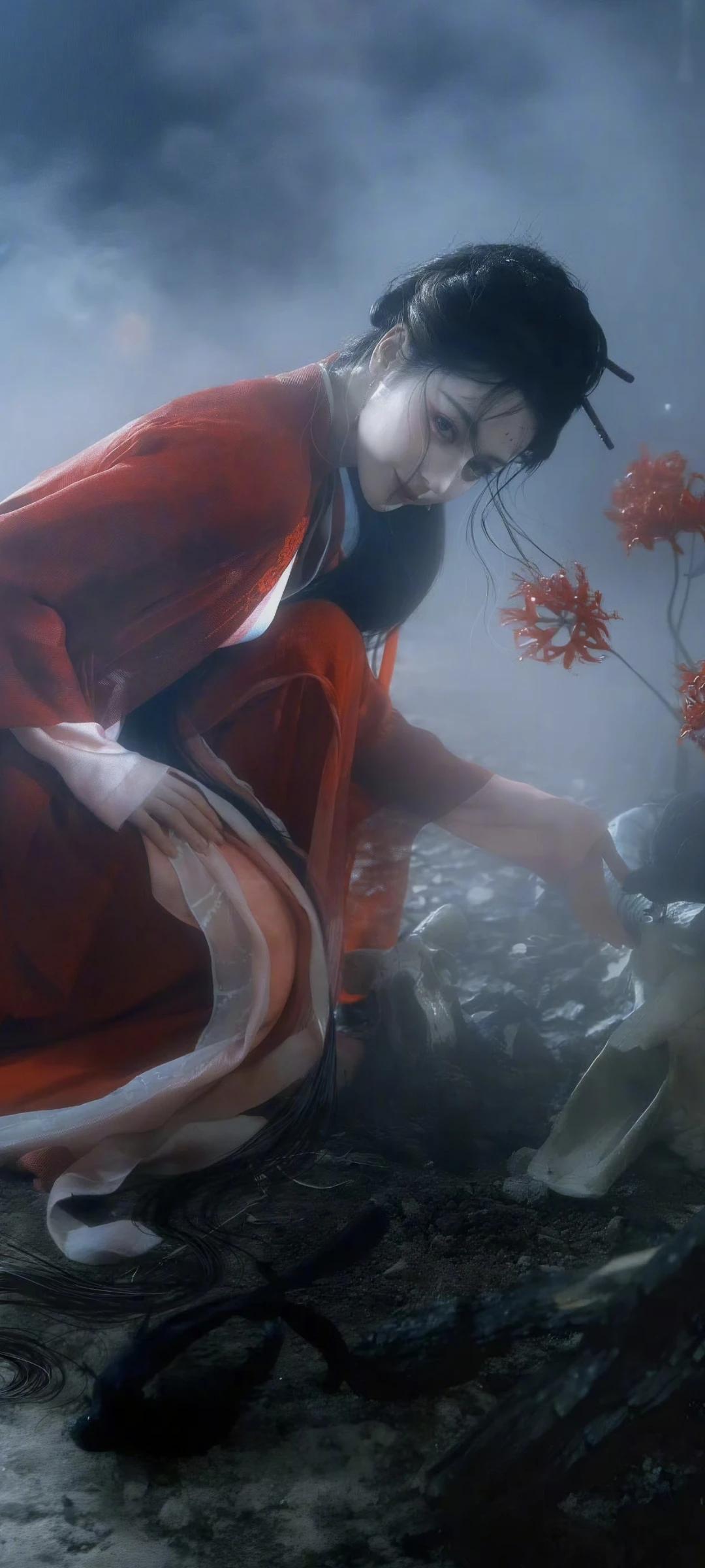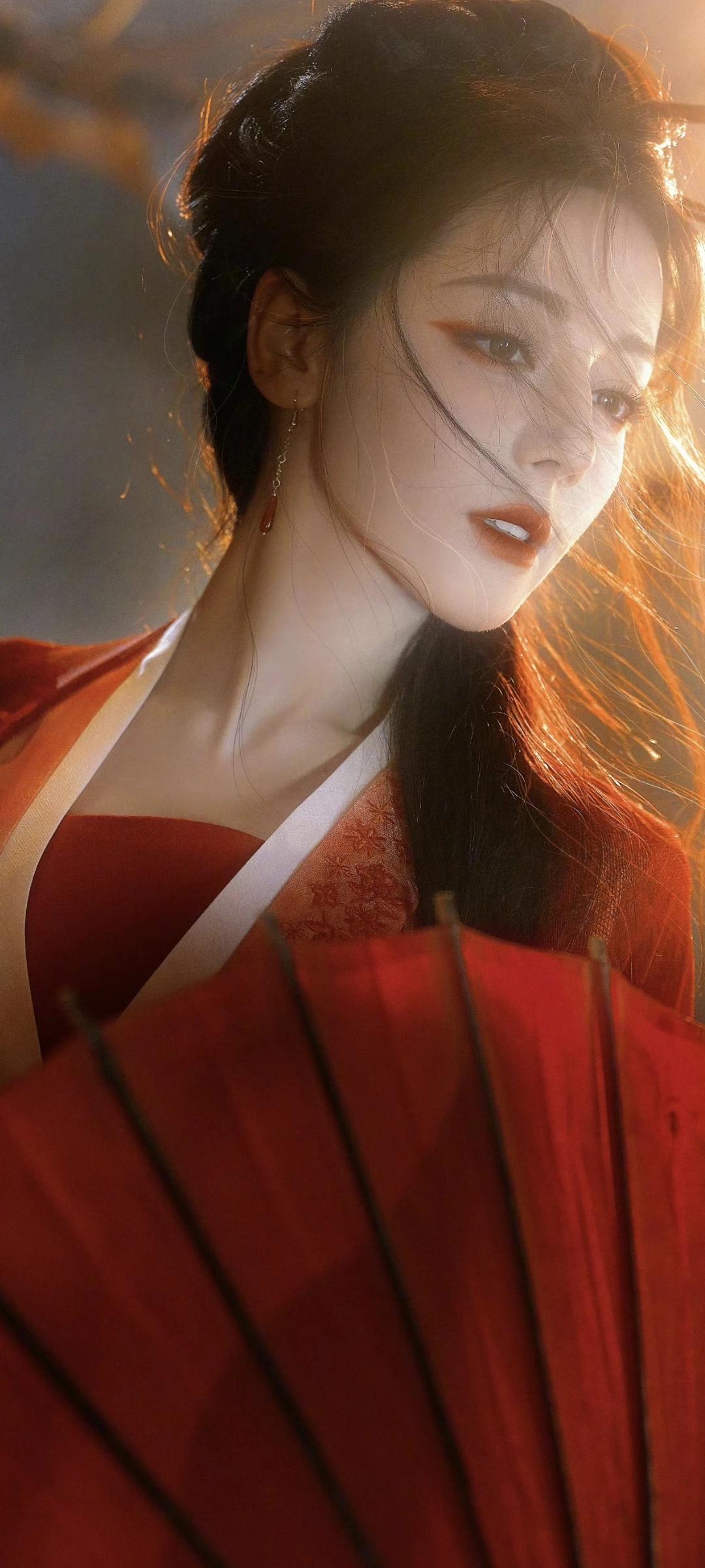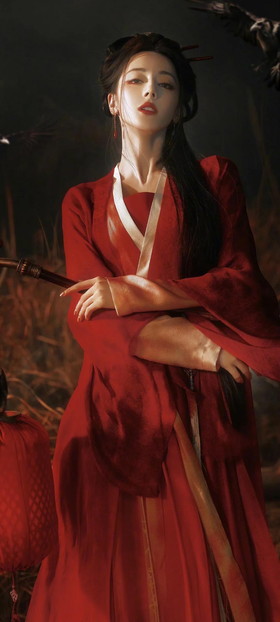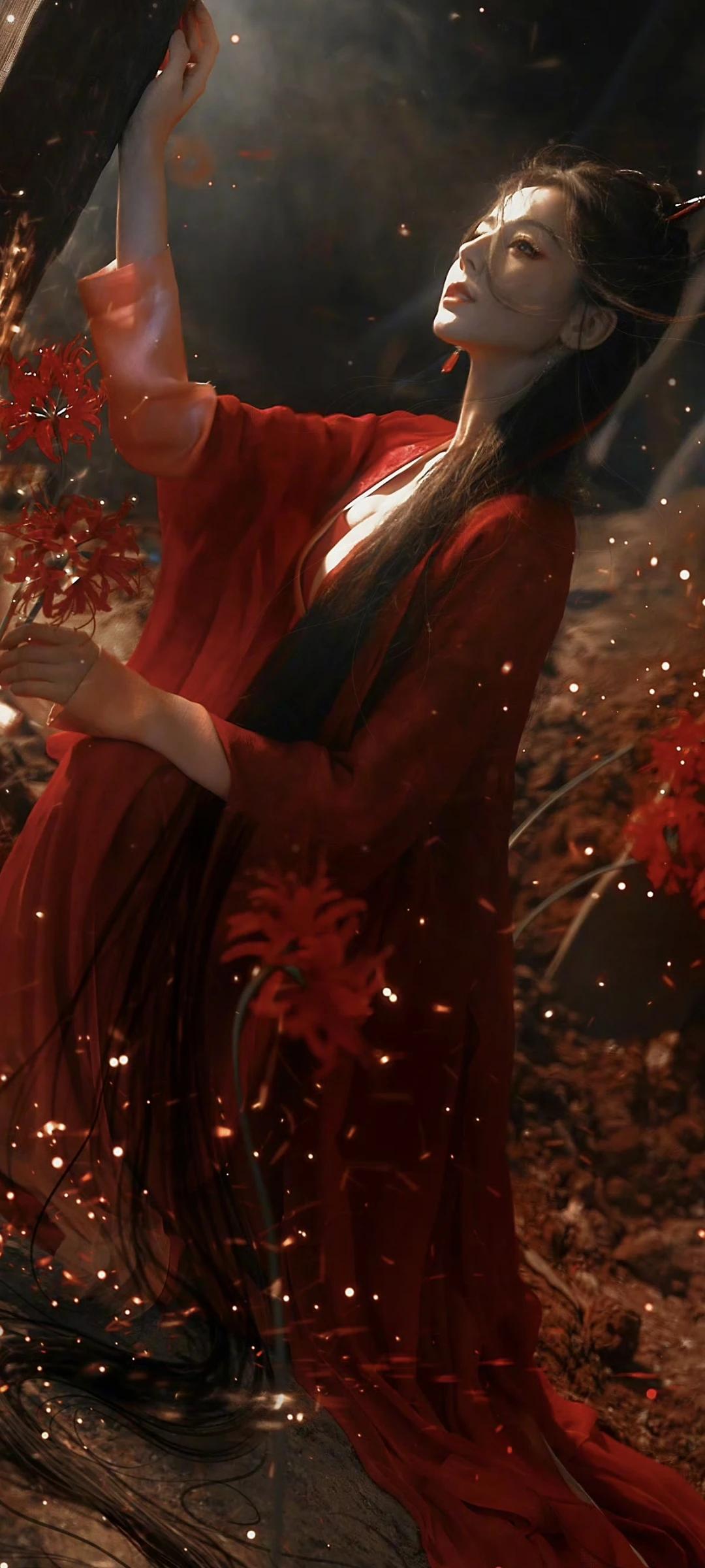 迪丽热巴壁纸~红衣如烈火般明艳,曼珠沙华在旁静静相伴,她在暗夜里,演绎着一场绝美的仙侠梦。