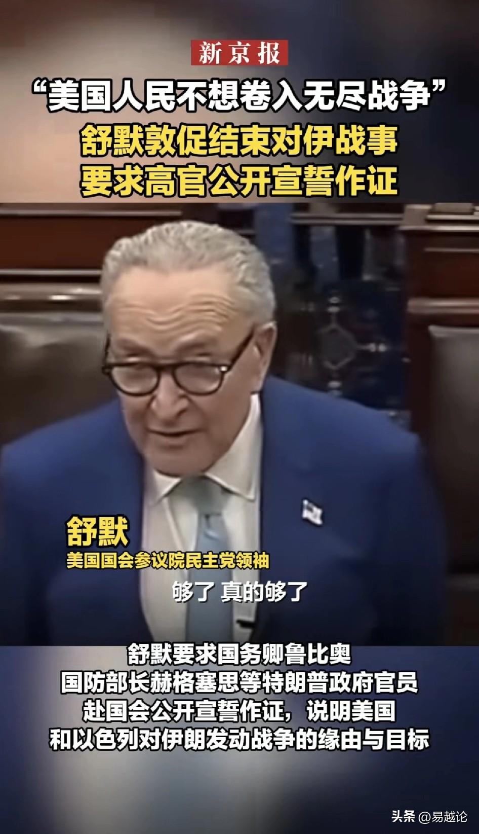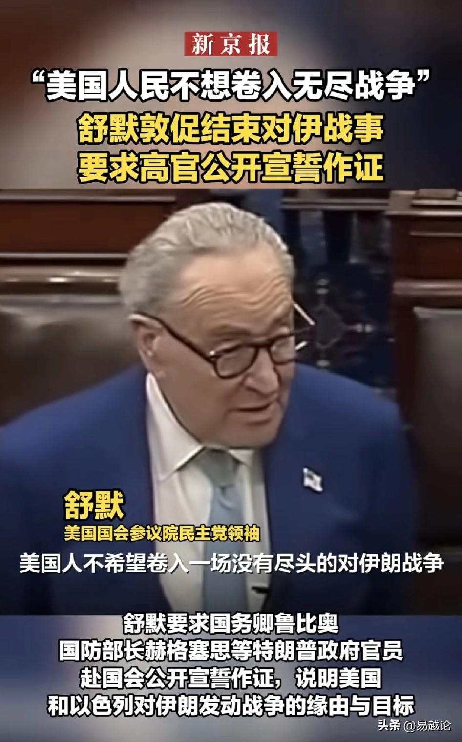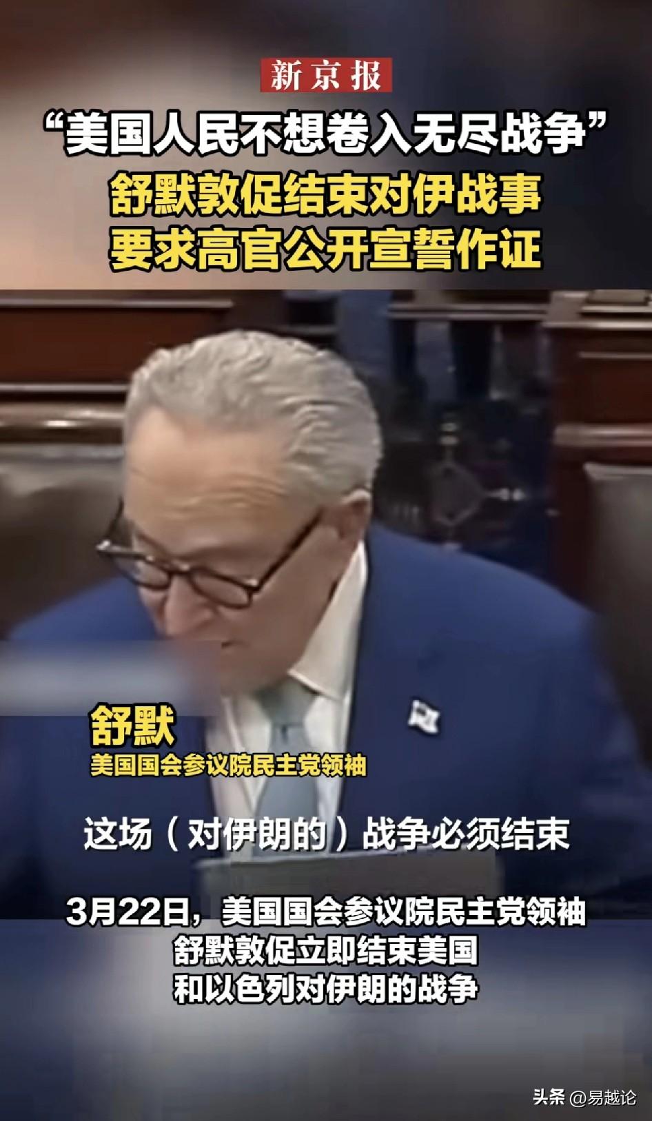 美国人不想卷入一场没有尽头的对伊战争。这是民主党在要求特朗普必须结束这场战争,但他能得逞吗?现在特朗普骑虎难下,已经被内塔尼亚胡带上路了,在高速路上,你想停车那是不可能的,除非你能找到出口,否则,最多就是在服务区加点油,吃点饭喝点水,回头还在高速路上继续狂飙。 现在美国在中东的基地几乎都被打了而且都产生了损失,你让特朗普怎么停?停下来就要被民主党人和其他反战的人们算账,日子更加不好过。 何况,伊朗目前还没有停止的意思,因为战略目标还没有达到,而且人家也不可能在面临巨大损失之后,就简简单单偃旗息鼓。 再回到舒默的话,他的借口是美国人不需要一场没有尽头的对伊战争,那怎么判断谁真正代表美国人,他们又需要什么样的战争呢?最多只能说,这场战争,他民主党一方没有得利而已。