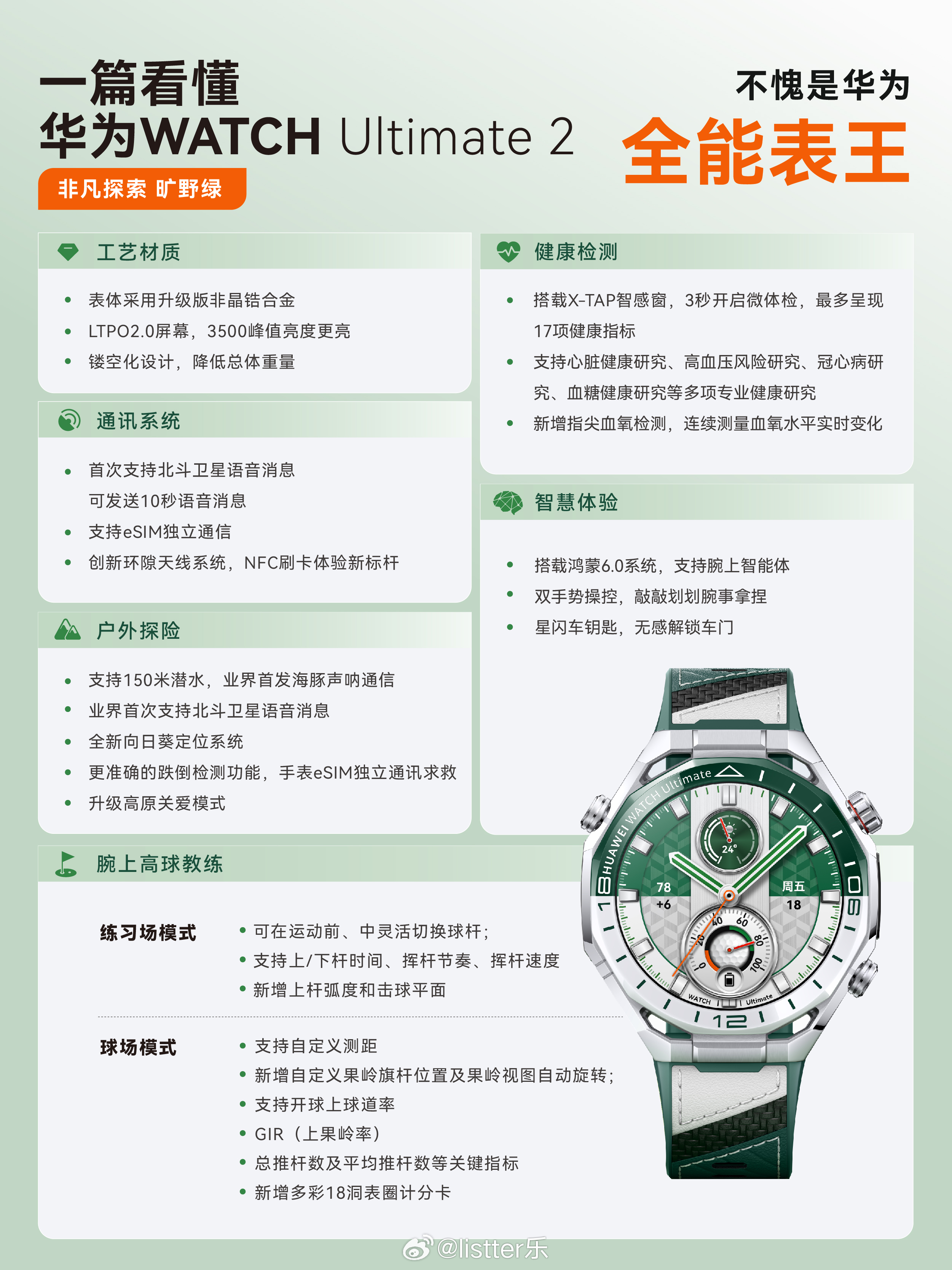 华为表王高尔夫功能有多强大通过强大精准的传感器和科学的算法,华为WATCH Ultimate 2 非凡探索 旷野绿能通过球杆切换、挥杆数据分析来帮助你提升高尔夫成绩,这对于喜欢打高尔夫的朋友来说真的堪比专业的教练,效果特强!此外这款手机还支持果岭视图、自定义旗杆、计分卡表圈等功能,结合“数据化训练+智能决策辅助”的核心能力,帮助用户从传统经验判断到数据驱动决策的转变,真正实现了一个随身携带的“腕上高球教练”!以前高端商务人士都喜欢戴劳力士等传统机械表,现在变了,大家都喜欢华为“智能绿水鬼”,真的是科技改变生活和认知的典范啊!