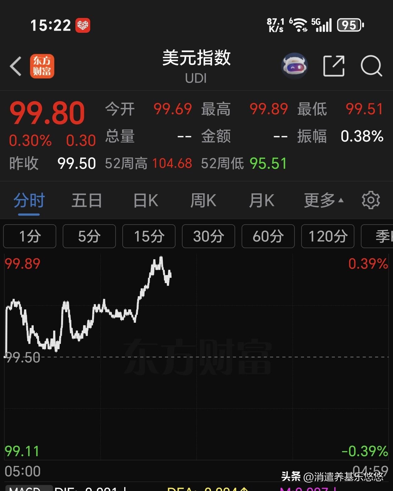 3点后,期货黄金再度跳水,跌幅近10%,这架势有可能跌破4000美元每盎司。期货石油又开始拉升,目前突破100美元每桶。美元价格指数走高,接近100。以上这三个期货紧跟中东消息,一句话,一个消息,都能刺激它们上蹿下跳。