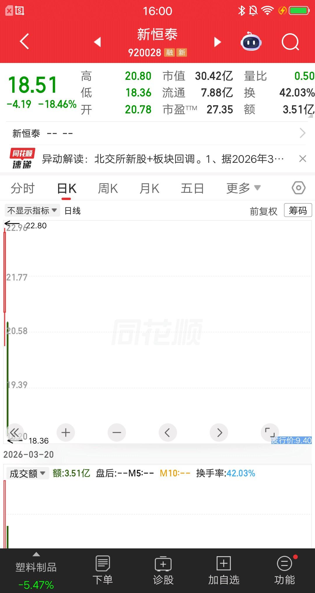 A股今天跌的最狠的票诞生了,跌幅榜第一位。行情很低迷,跌停个股超过一百只。你以为跌停够狠了,有一只票比跌停更惨。该票集合竞价大幅低开8.46%,开盘后震荡下挫,收盘跌幅18.46%,差不多等于两个地板了。 该票是北交所上市新股,首日涨幅高达1.4倍,股价涨到22.8元。上周五进的资金,今日全部闷杀。主力没焊死车门,让散户割肉出局,蛮良心的了。 公司属于塑料制品行业,主营业务是功能性高分子发泡材料的研发、生产与销售。 三大核心产品 - PE Foam(化学交联聚乙烯发泡)用于建筑装饰、汽车内饰、包装、地板静音层。 - IXPE(电子辐照交联聚乙烯发泡)主要用于PVC地板静音层。 - MPP(聚丙烯微孔发泡)用于新能源电池缓冲垫、5G天线罩、消费电子;国内市占领先,客户含宁德时代、比亚迪、华为。