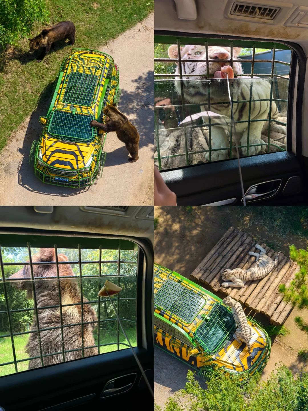 ✔️酋长之家:乘坐老虎大巴车进入猛兽区域,如果想近距离看白虎跳到车顶上,也是要坐VIP车,大棕熊看到我手里的苹果,一直急着转圈圈😂