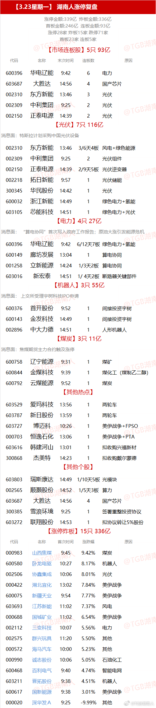【3.23星期一】 湖南人涨停复盘 "涨停金额:339亿 炸板金额:336亿首板金额:246亿 连板金额:93亿涨停28家 炸板15家 跌停71家首板23家 连板5家" 【市场连板股】5只 93亿 代码 名称 末次时间 连板数 原因600396 华电辽能 9:42 6 电力603687 大胜达 14:56 4 国产芯片002310 东方新能 13:46 3 光伏002309 中利集团 9:25 2 光伏002150 正泰电源 14:39 2 光伏【光伏】7只 116亿 消息面:特斯拉计划采购中国光伏设备 002310 东方新能 13:46 3/6天4板 风电+绿色能源002309 中利集团 9:25 2 光伏组件002150 正泰电源 14:39 2/9天5板 光伏逆变器002218 拓日新能 9:57 1 光伏储能300345 华民股份 14:42 1 光伏600032 浙江新能 14:49 1 绿色电力+氢能603105 芯能科技 14:51 1 绿色电力+光伏【电力】4只 27亿 消息面: “算电协同”首次写入政府工作报告;原油大涨引发能源危机 600396 华电辽能 9:42 6/12天7板 绿色电力+氢能600149 廊坊发展 13:04 1 算电协同001258 立新能源 14:24 1/3天2板 算电协同603016 新宏泰 14:51 1/ 4天2板 断路器关键部件【机器人】3只 55亿 消息面: 上交所受理宇树科技IPO申请 600376 首开股份 9:52 1 间接投资宇树600143 金发科技 14:49 1 间接投资宇树002896 中大力德 14:51 1 人形机器人【煤炭】3只 11亿 消息面:焦煤期货主力合约触及涨停 600758 辽宁能源 9:31 1 煤矿600844 金煤科技 9:39 1 煤化工(煤制乙二醇)600792 云煤能源 9:52 1 煤炭【其他热点】 603529 爱玛科技 13:56 1 两轮车603787 新日股份 13:59 1 两轮车603727 博迈科 10:26 1 美伊战争+FPSO000703 恒逸石化 13:06 1 美伊战争+PTA603616 韩建河山 13:01 1 拟收购兴福新材300868 杰美特 14:23 1 拟收购戴尔蒙德【其他个股】 603803 瑞斯康达 14:49 1/10天5板 光模块002565 顺灏股份 14:52 1/5天3板 算力603687 大胜达 14:56 4 国产芯片300385 雪浪环境 9:25 1 签署重整投资协议603272 联翔股份 14:53 1 拟协议转让5%股份【涨停炸板】15只 336亿 代码 名称 首次时间 涨跌幅 原因000983 山西焦煤 9:45 9.42% 煤炭600580 卧龙电驱 10:27 8.17% 机器人002506 协鑫集成 10:06 8.01% 光伏000422 湖北宜化 13:02 7.84% 美伊战争600075 新疆天业 9:54 7.77% 美伊战争603693 江苏新能 11:02 7.37% 风电000688 国城矿业 11:02 6.54% 美伊战争002112 三变科技 10:07 5.56% 电力002575 群兴玩具 11:20 5.50% 其他000572 海马汽车 10:00 5.23% 其他000990 诚志股份 10:06 5.05% 石油化工600468 百利电气 9:40 4.74% 智能电网603211 晋拓股份 9:38 4.51% 机器人600617 国新能源 9:38 3.01% 美伊战争000020 深华发A 9:25 -9.99% 其他