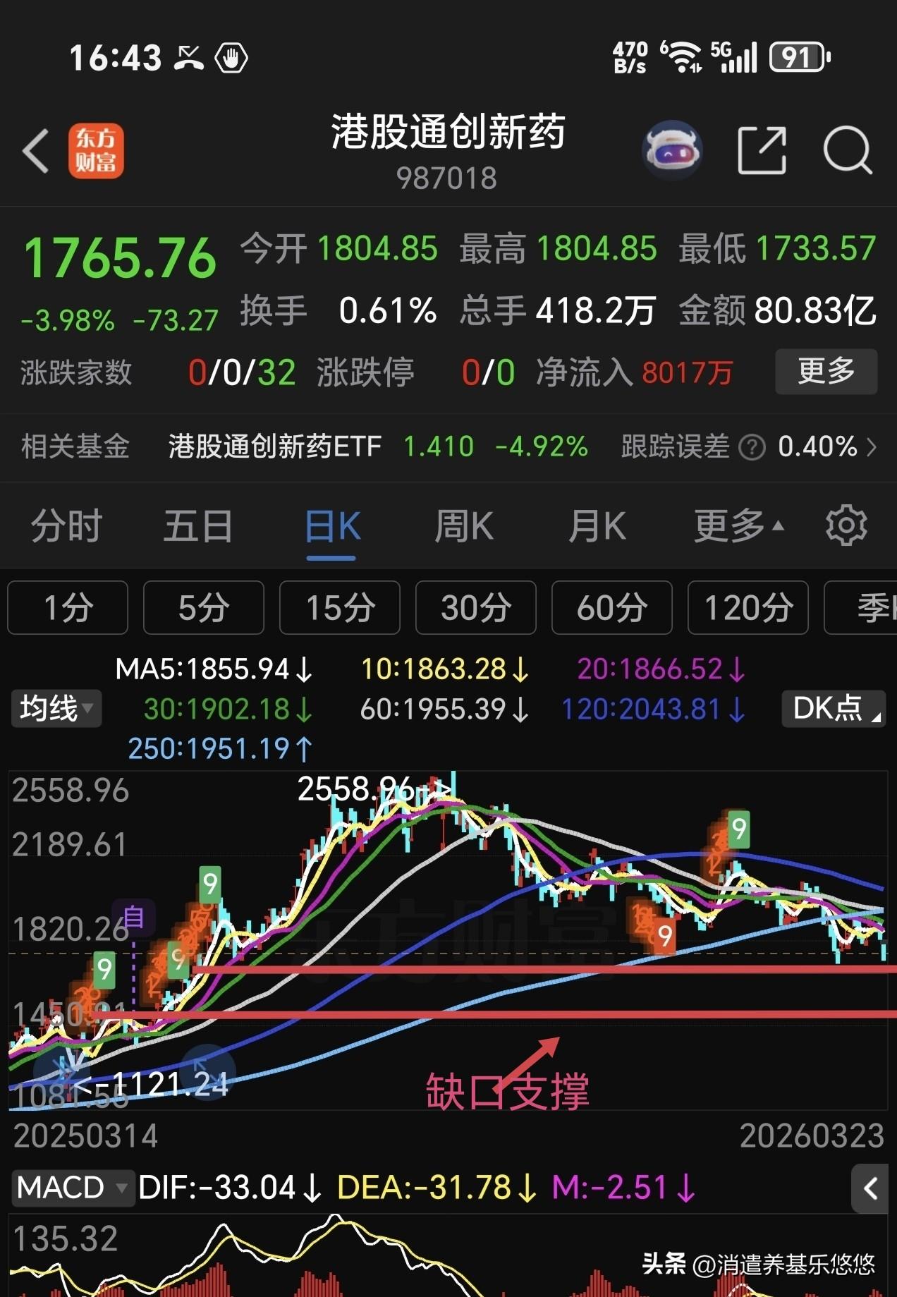 港股通创新药与恒生科技收盘,比预期的还要弱。恒生科技原来预期能在4500-4600区间止跌企稳,看来这个区间止不住,今天最低点打到4657点,4500再砸一天就能跌到位,恒科还要继续向下寻找支撑,看前面低点4300点支撑力度怎么样吧。 港股通创新药马上就要到了前面低点,这个低点守住了,就是一个小双底,守不住,继续下跌,看下方缺口支撑位1500点左右,还有15%。26年以来,日子太不好过了。