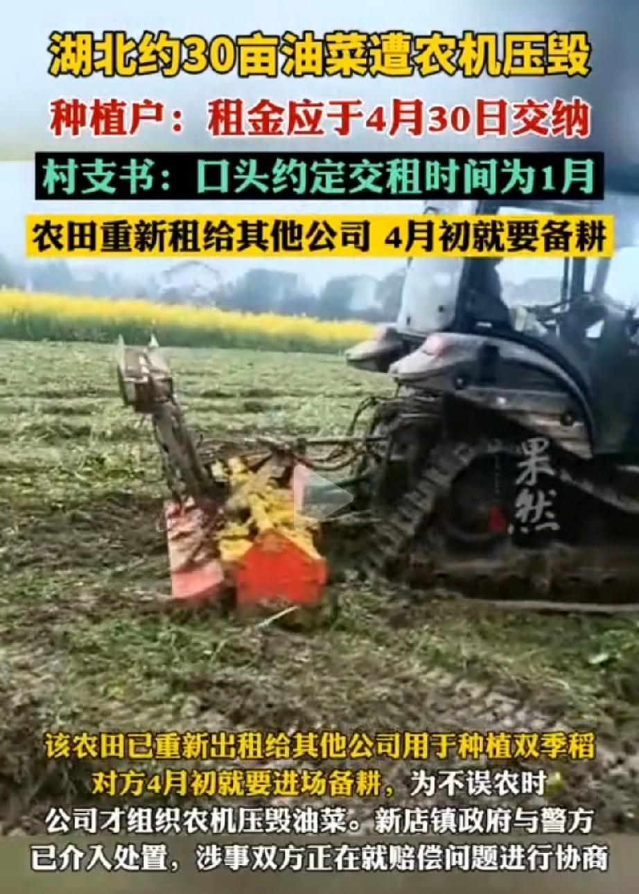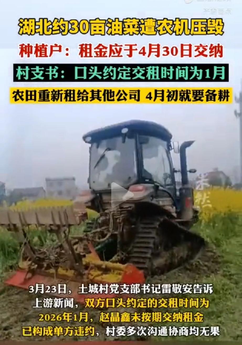 有点缺德!湖北咸宁,种植户老赵在村里承包了30亩地种油菜,眼看着要丰收了,没成想被农机直接压毁,事前没收到任何通知。 村支书:口头约定交租时间为1月,农田重新租给其他公司! 据老赵说:去年4月30日和村里达成了口头协议,承包这片地种油菜。说好的是一年一交租金,今年4月30日才到交租的日子。 老赵心里踏实啊,辛辛苦苦把地种上,油菜长得特别好,最高的已经窜到1米5了。按照他的说法,再过一个来月,就能收割了。30亩地,那可是他一年到头的指望。 可3月20号那天,出事了。老赵完全没收到任何通知,突然就看到两台农耕机开进田里,轰隆隆地开始压油菜。 他赶紧跑过去拦,根本拦不住。等他报警后才得知,这压油菜的事儿,居然是村委会同意的! 老赵当场就懵了,这地不是好好的种着吗?怎么突然就要毁掉? 3月23日,村支书雷敬安说双方口头约定的交租时间其实是今年1月份,不是4月30日。 老赵没按时交租金,属于单方面违约。村里多次沟通协商,都没有结果。 最后没办法,才组织农机把油菜压了,因为这片地要重新租给别的公司,人家4月初就要备耕。 现在的情况是,镇政府已经介入,警方也在调查。双方正在就赔偿问题进行协商。 但地里的油菜已经没了,种了一季的心血,全白费了。 有网友说:“就算人家没交租金,你也不能趁着快熟了直接压啊!给人个期限,让人把这一季收了不行吗? ” 也网友说:“种地多不容易啊!从播种到长到1米5,流了多少汗?这一压,一年的收成全没了! ” 还有网友问:“交租时间到底是1月还是4月?这个关键点必须说清楚!如果真是4月,那村里凭什么压人家的庄稼? ” 金灿灿的油菜花,是农民用汗水浇灌出来的希望。1米5高的油菜,再过一个月就能变成实实在在的收成。可就这么被农机无情地碾过,变成了一地烂泥。 不管双方在租金时间上有什么争议,处理问题的方式真的可以更人性化一些。 就算要收回土地,能不能先沟通,给种植户一个缓冲期?让他把这季油菜收了,把损失降到最低? 好在目前镇政府已经介入,双方正在协商赔偿。但不管最后赔多少钱,那些已经倒下的油菜,再也回不来了。 这件事给咱们所有人都提了个醒: 第一, 不管租地还是做生意,重要的约定一定要写在纸上。一个说4月交租,一个说1月交租,差了好几个月,这种糊涂账最容易出问题。 第二,村里觉得对方违约,可以走法律程序,可以发正式通知,而不是趁人不在直接压庄稼。这种“暴力执法”式的方式,只会激化矛盾,最后谁都占不着便宜。 第三, 农民种地有多苦,只有真正干过的人才知道。从播种到收获,中间要经历多少风吹日晒、起早贪黑。30亩油菜,那是多少个日夜的心血啊! 希望有个妥善的处理结果,以后类似的土地纠纷,双方都能坐下来好好商量,别让无辜的庄稼,成为矛盾激化的牺牲品。 毕竟,土地是农民的命根子,庄稼是他们一年的指望啊! 这样一压了之,表面上解决的是“土地归属”问题,实际上毁掉的是一个家庭的生计和希望。 30亩即将成熟油菜被农机压毁